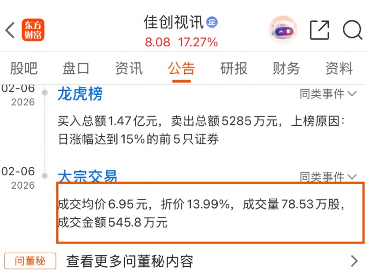 $佳创视讯(SZ300264)$ 大宗交易折价14个点,资金提桶跑路了。