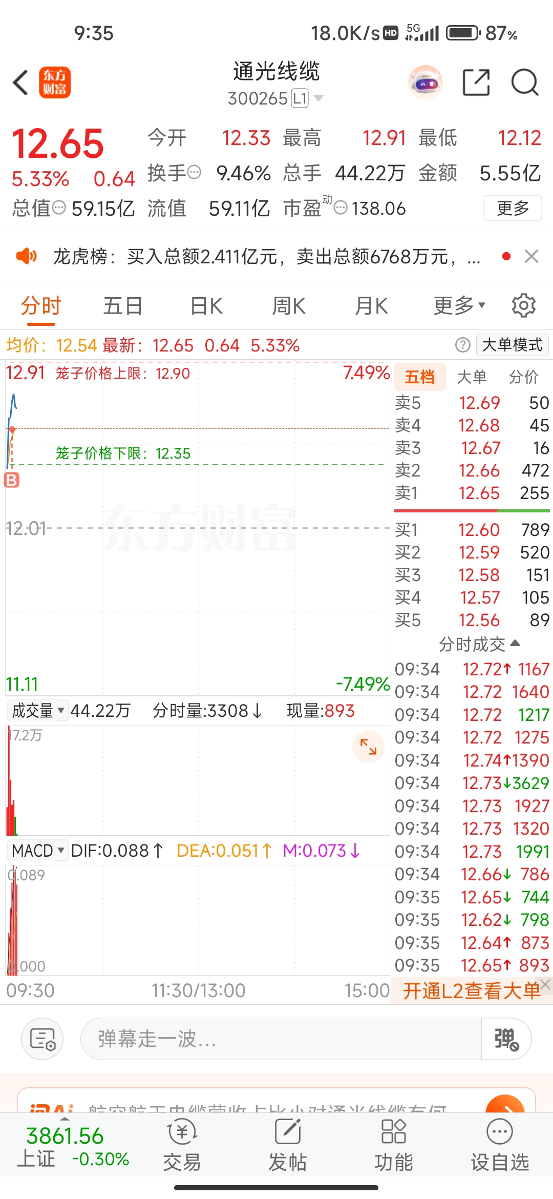 $通光线缆(SZ300265)$ 今天敢买入真是大胆一点,等着吧拉涨停板就买不了