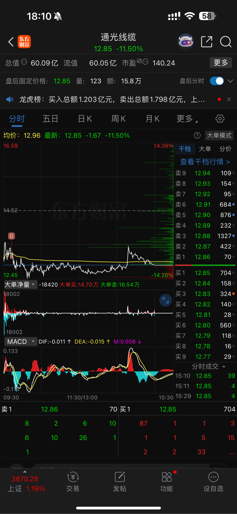 $通光线缆(SZ300265)$ 今天的通光没有走,早盘甚至还补了,但是没有想到在那个位置补也是高位。上周五进的,十多厘米的大肉没有跑,今天又回来了,再坚持看看,我相信我的眼光