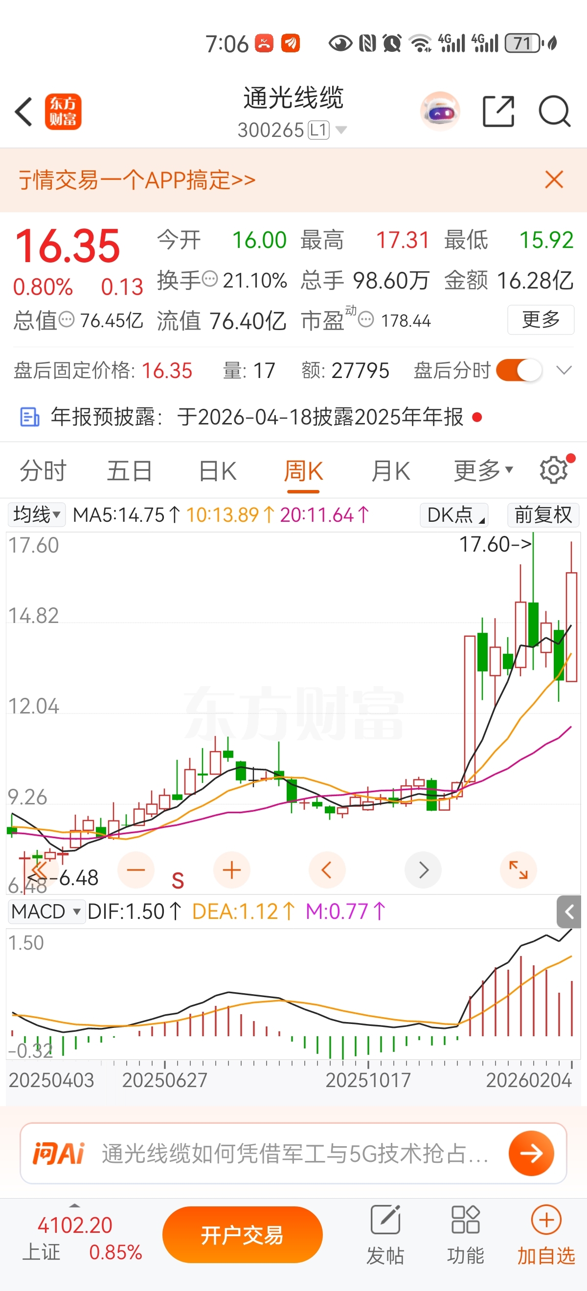 $通光线缆(SZ300265)$ 看周线,已经突破了平台,还会有新高