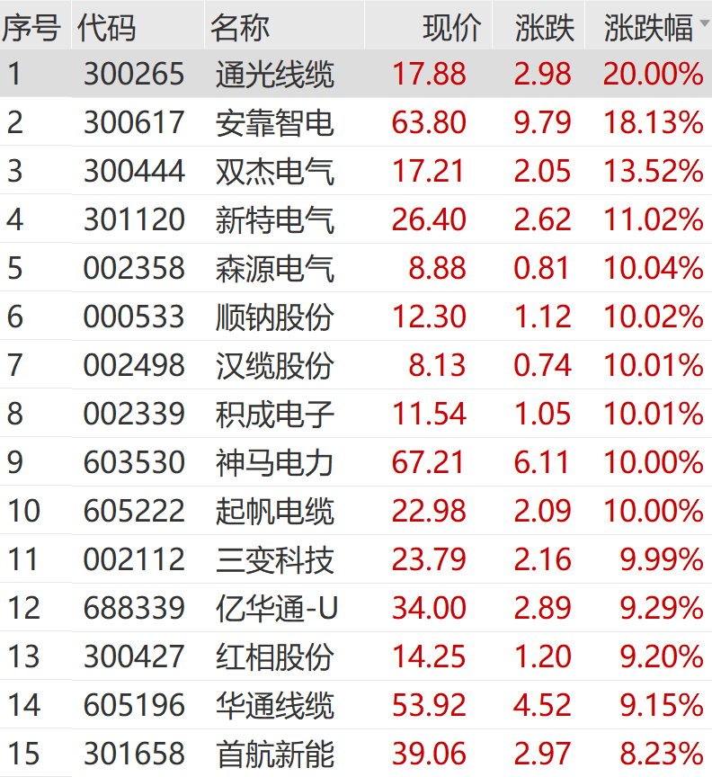个股方面,通光线缆20cm涨停,安靠智电接近20cm涨停,森源电气、顺钠股份、积成电子、汉缆股份等多股集体涨停。