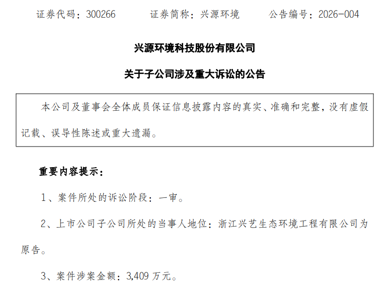 对于投资者最为关心的损益影响,兴源环境表示,上述案件尚未开庭审理,公司目前无法评估本次诉讼对公司财务状况、本期利润或期后利润的影响。公司将按照企业会计准则规范进行相应会计处理,最终影响金额以会计师审计确认后的数据为准。