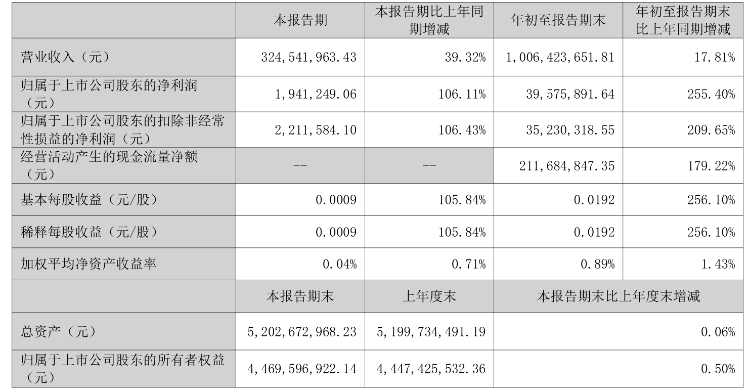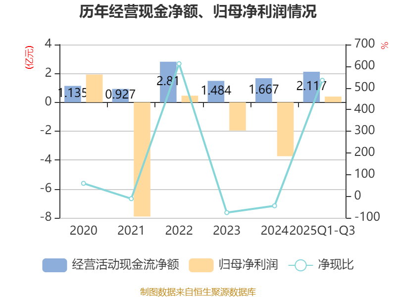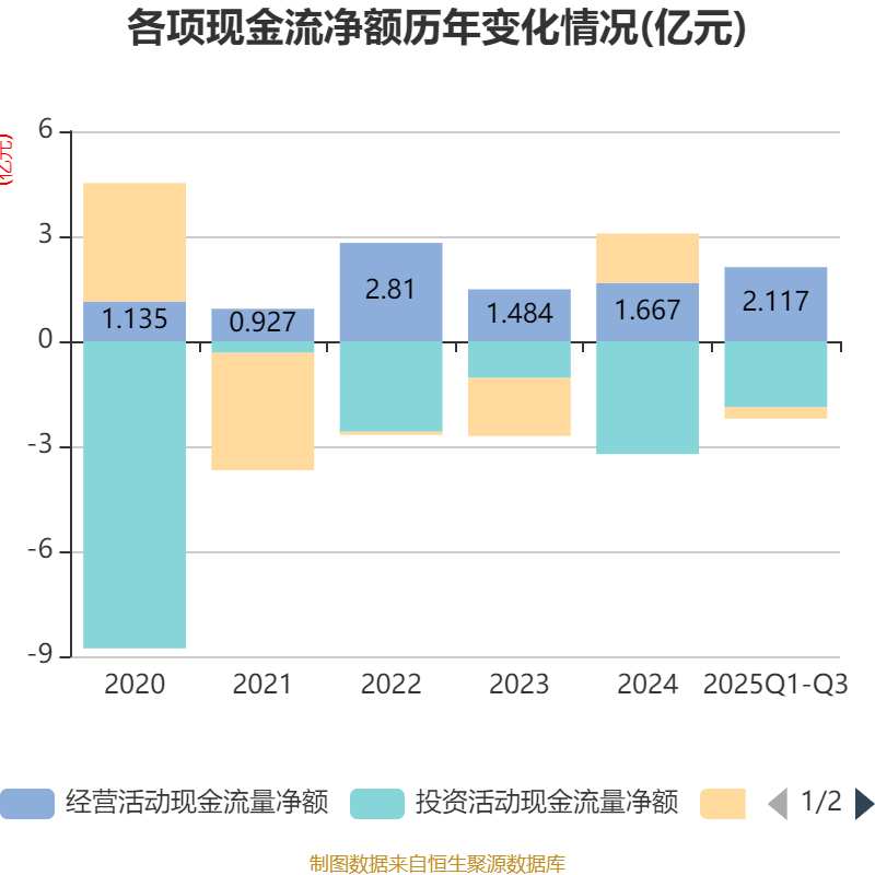 2025年前三季度,公司经营活动现金流净额为2.12亿元,同比增长179.22%;筹资活动现金流净额-3314.02万元,同比减少1.71亿元;投资活动现金流净额-1.88亿元,上年同期为-2.61亿元。