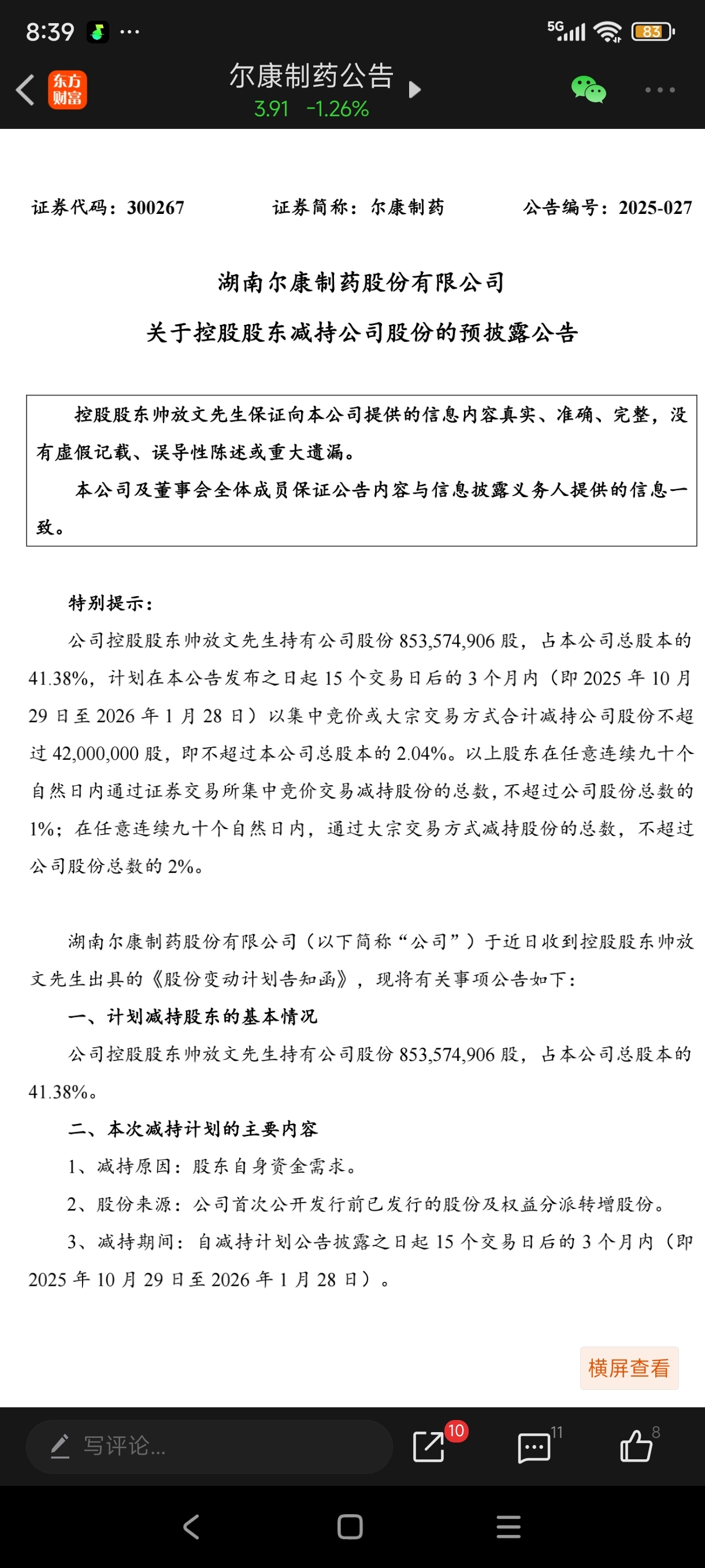 股东这个减持大王炸终于出现了4200万股看哪一个主力资金敢来抬轿子接。前两天还有