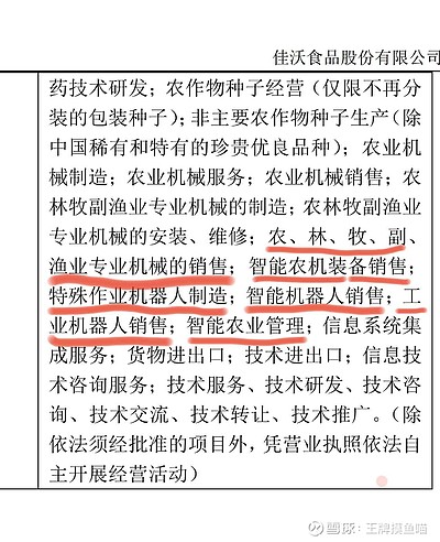 $*ST佳沃(SZ300268)$佳沃在经营范围中增加机器人是突发奇想吗?首先,联想集团的的确确在机器人领域有深度产业布局。然后,农业机器人公司丰疆智能拟赴港ipo, 说明机器人在农业服务领域大有可为(亦属于农业设备机械及智能农业管理范畴,与新增经营项相符)。
