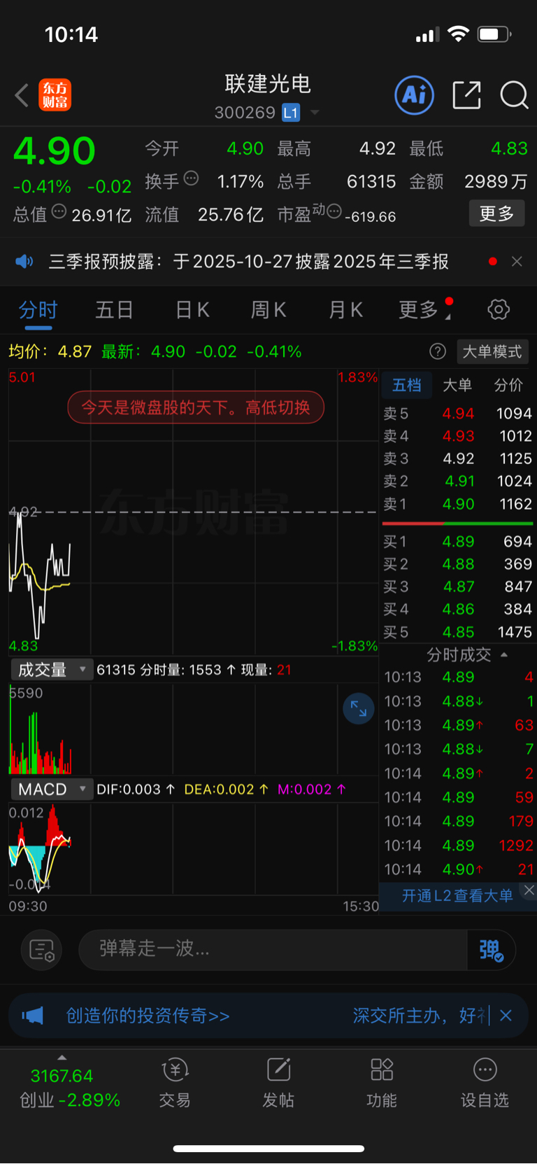 $联建光电(SZ300269)$ 今天主力高低切换,微盘股的天下,联建加油!