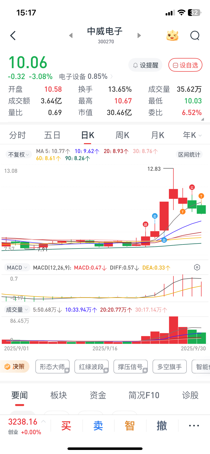今早加仓了一点,还以为会涨,结果哎!尾盘清仓了,没戏了,走坏了均线,要看清现实,