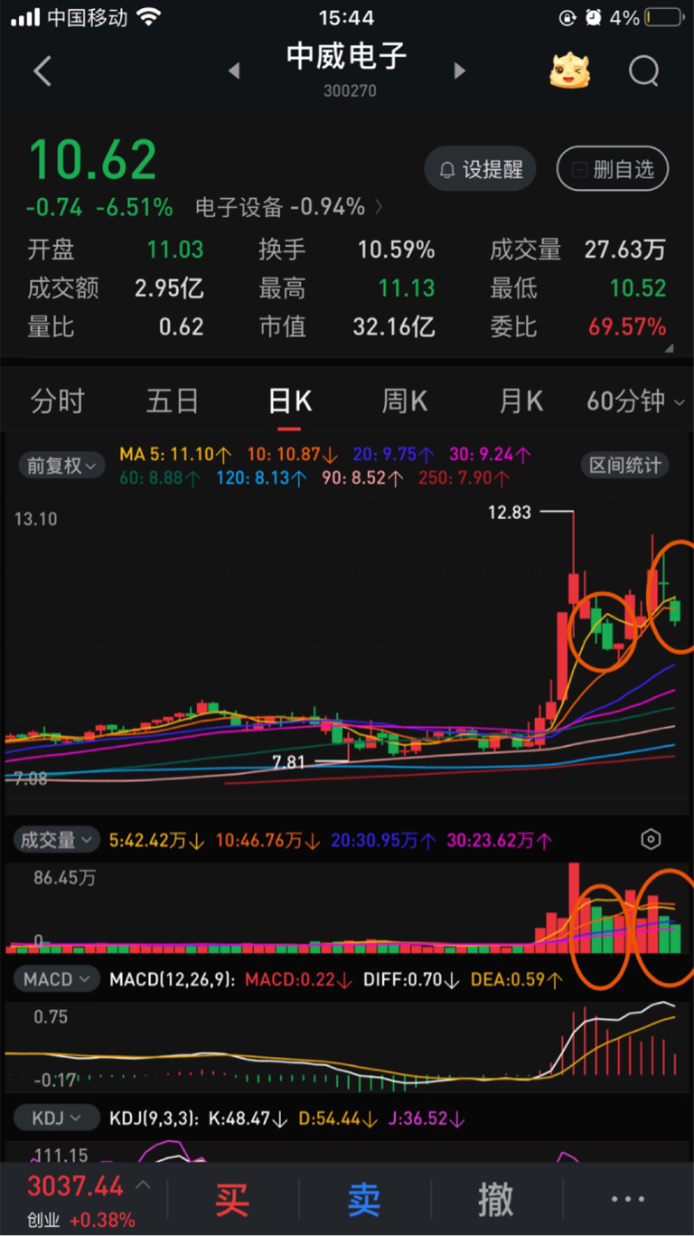 $中威电子(SZ300270)$ 这股昨天冲高没走的,等后面冲高走。前天逆大盘冲了15%几次12上站不稳,加上昨天早盘又冲了下12边 还是站不稳回落,参考上次走势。