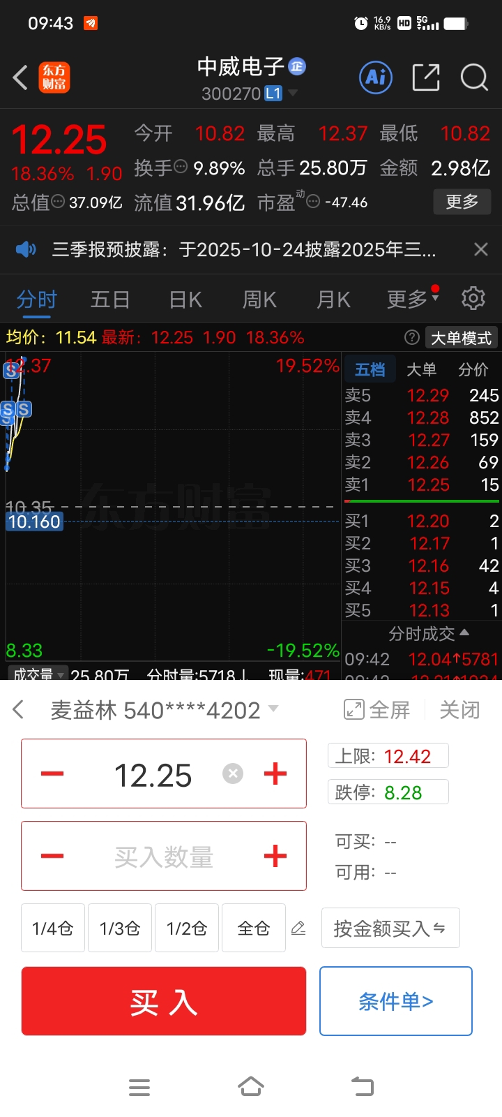 $中威电子(SZ300270)$ 亏大了,周五一路买一路跌下来,买了6次,今天就一路卖一路涨