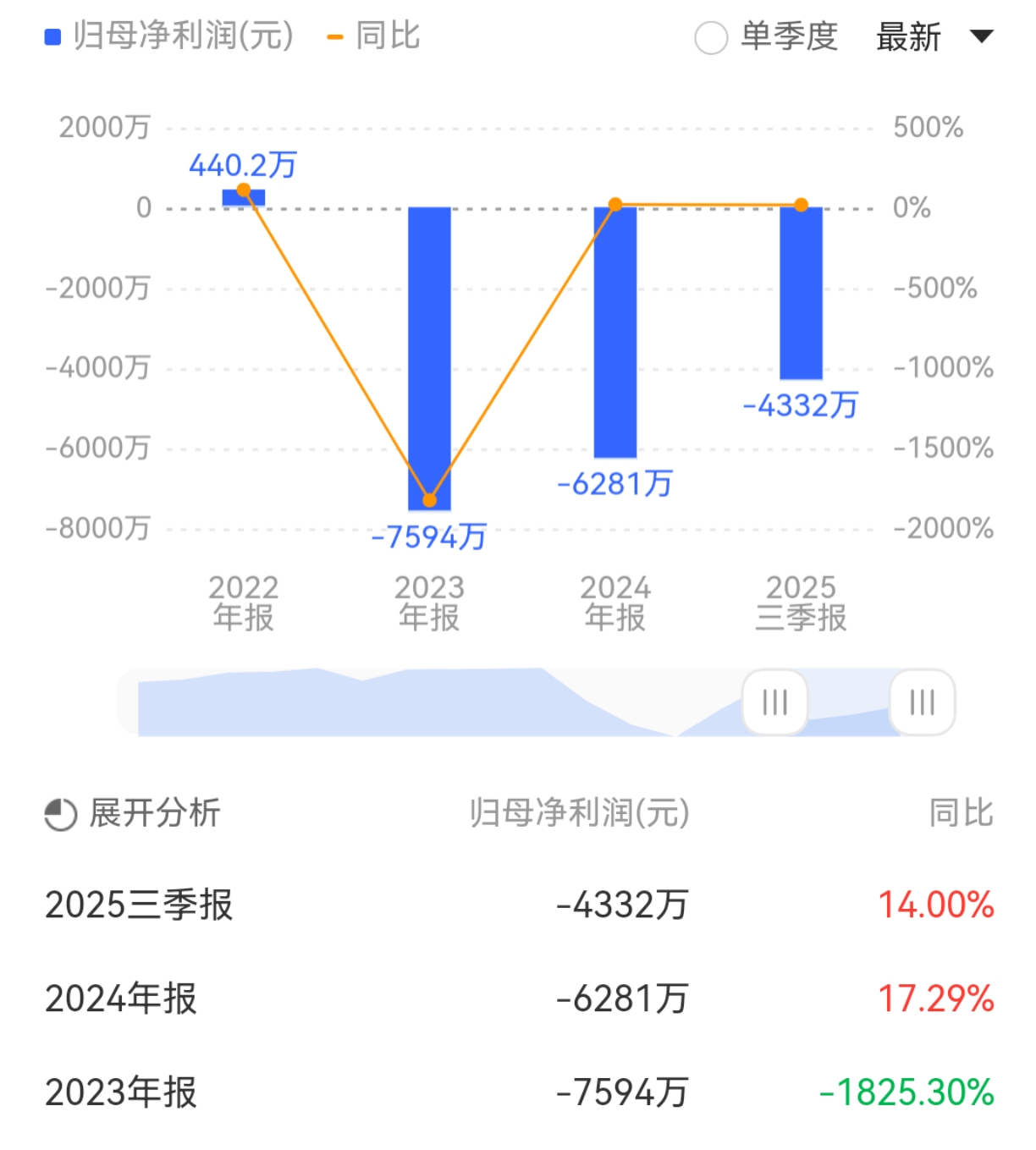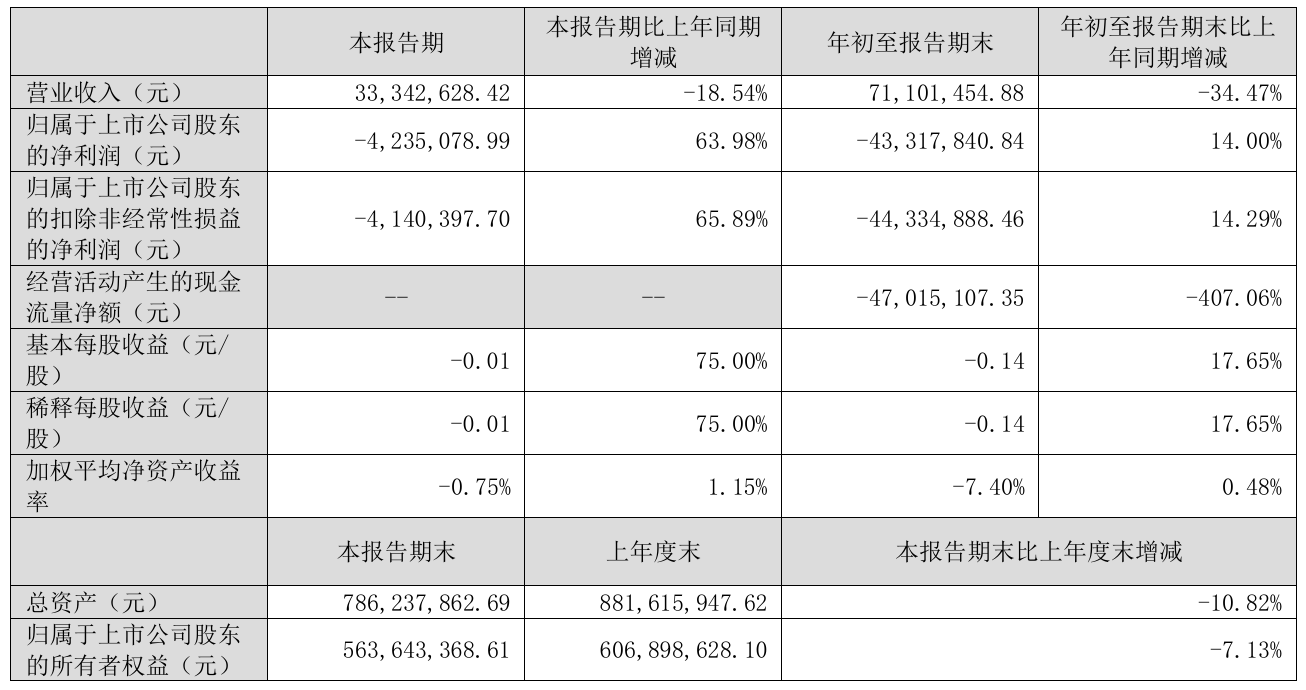 2025年前三季度,公司营业收入为7110.15万元,同比下降34.47%;归母净利润为-4331.78万元,同比增长14.00%;扣非归母净利润为-4433.49万元,同比增长14.29%。