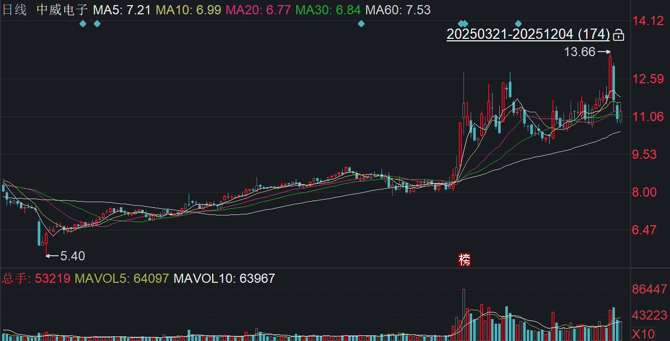 二级市场上,截至12月4日收盘,中威电子上涨2.83%报11.25元/股,总市值约34.07亿元,今年来公司股价累计上涨近六成。
