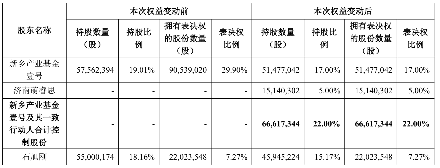 此外,石旭刚与新乡产业基金壹号协商一致并签署协议,解除双方此前约定的将部分表决权委托至新乡产业基金壹号的安排,由石旭刚承诺放弃其持有的7.90%股份对应的表决权。