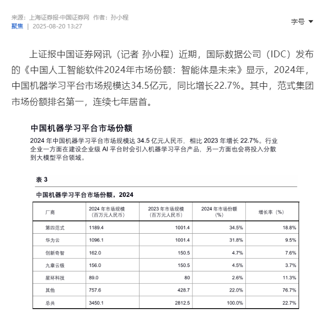 上证报中国证券网讯(记者 孙小程)近期,国际数据公司(IDC)发布的《中国人工智能软件2024年市场份额:智能体是未来》显示,2024年,中国机器学习平台市场规模达34.5亿元,同比增长22.7%。其中,范式集团市场份额排名第一,连续七年居首。