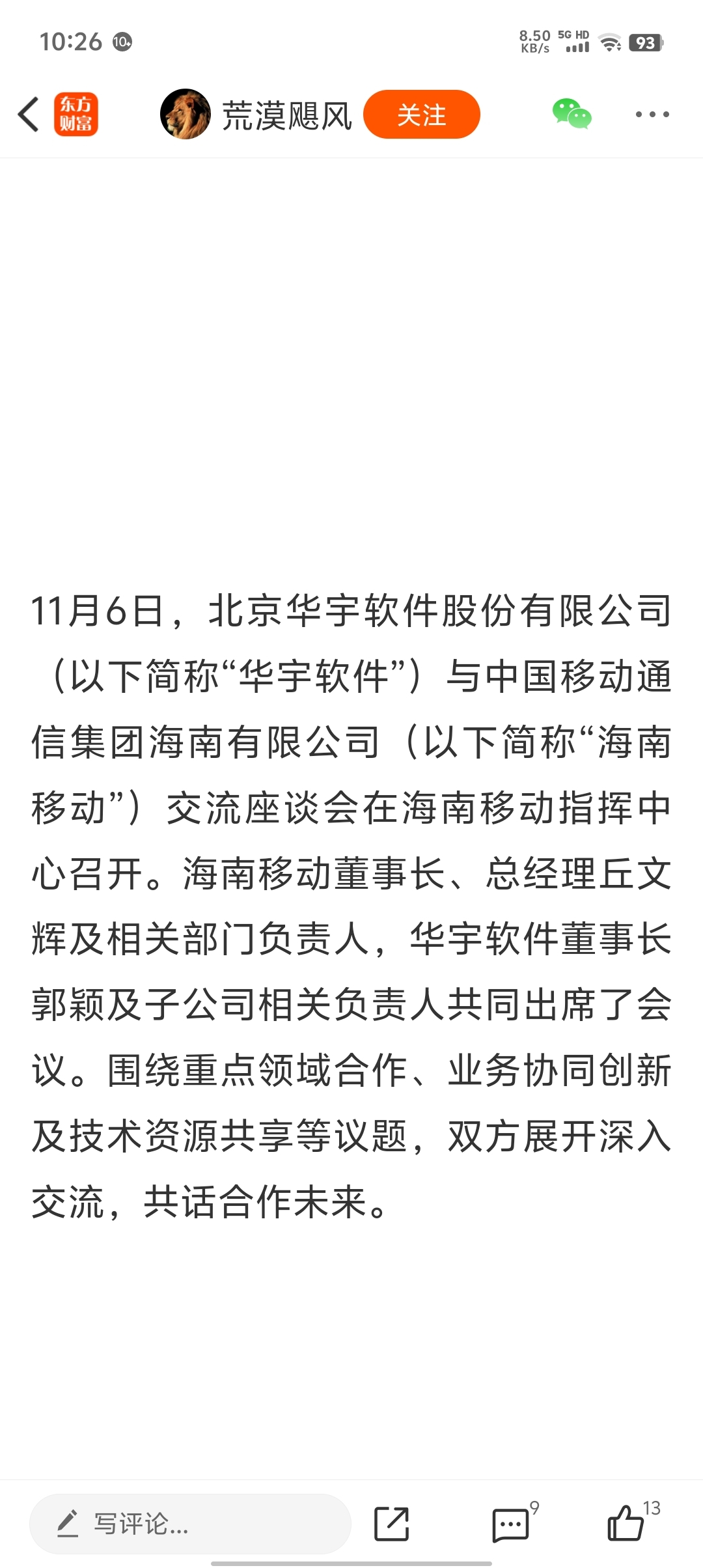 $华宇软件(SZ300271)$ 移动有行动了,二十二元进了几十亿,海南,这是一个赚钱的好地方,自由贸易区,大优惠