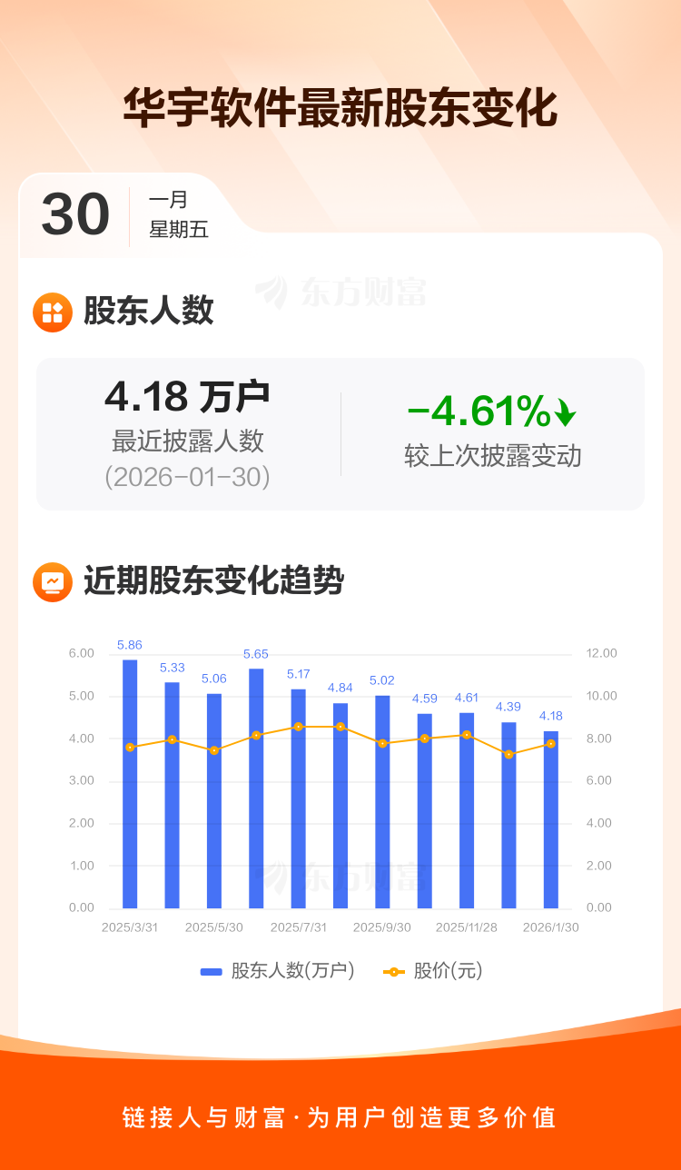 华宇软件最新披露数据显示,截至1月30日公司股东户数为4.18万户,较上期(2025年12月31日)减少2024户,降幅为4.61%。户均持有流通股数量由上期的1.82万股上升至1.91万股,户均持股金额由上期的13.20万元增加至14.81万元。