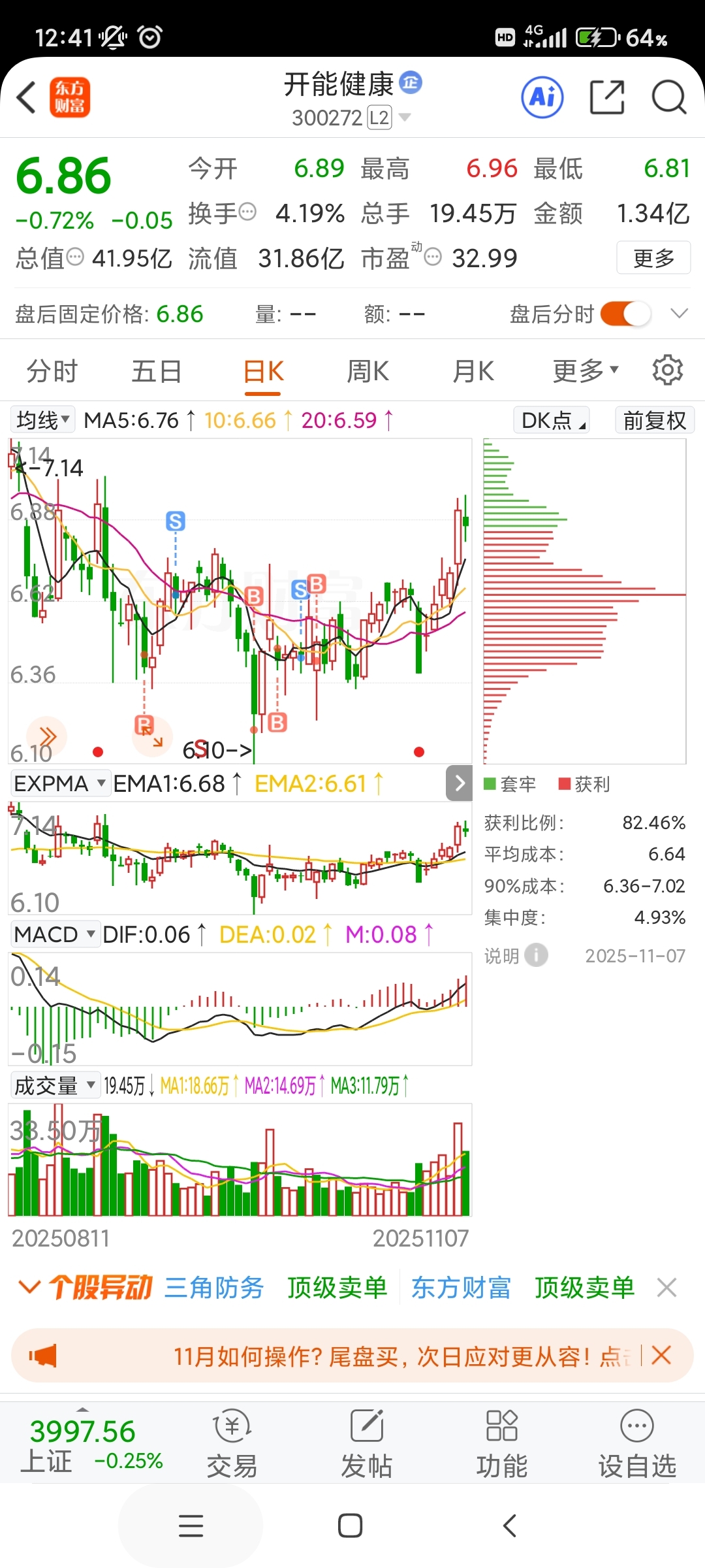 $开能健康(SZ300272)$ 十万多股看看主力高度