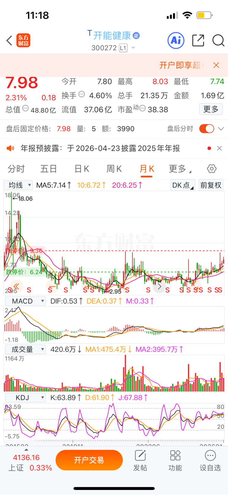$开能健康(SZ300272)$ 下周估计有一次涨停月线破前高,立贴为证。