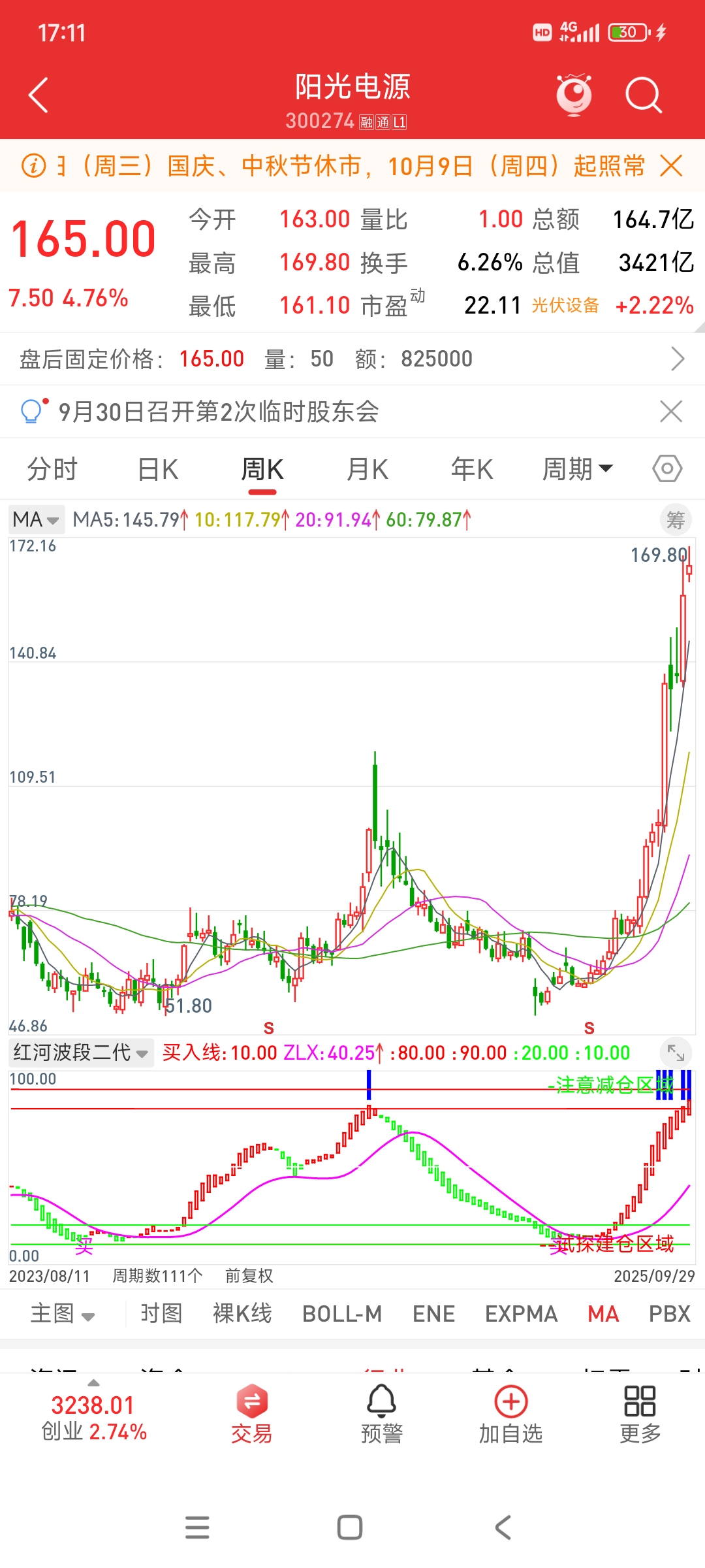 $阳光电源(SZ300274)$ 这票只能是持筹者的盛宴,短线很难有介入点的,看看就好。周线红柱延续就不说了,红柱不停,上涨不止,红柱拉长,加速不止,这里毫无疑问还是上涨趋势