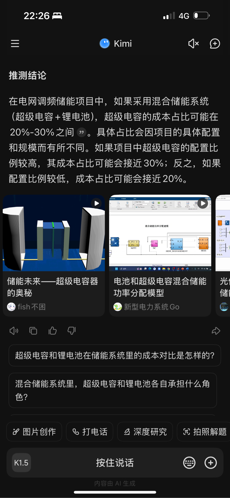 • 根据某混合储能调频系统的案例,超级电容的成本占比约为20%-30%。