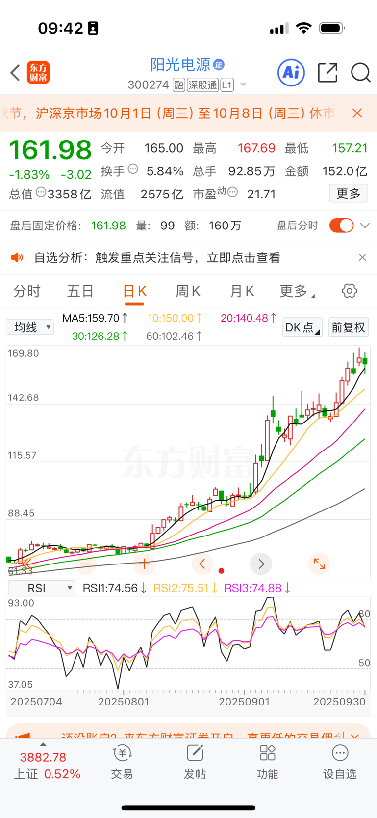 $阳光电源(SZ300274)$ 请教一下,最近在学技术分析,这个rsi是否出现顶背离了?
