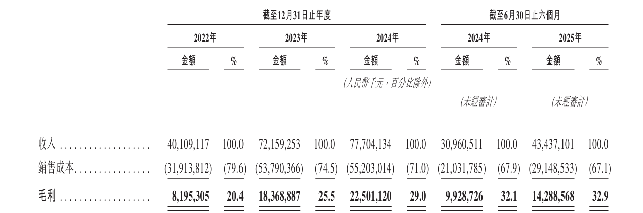 业绩方面,2022年至2024年及2025年上半年(下称“报告期”),公司实现营业收入分别为401.09亿元、721.59亿元、777.04亿元及434.37亿元;期内利润分别为36.96亿元、96.09亿元、112.64亿元及78.30亿元。
