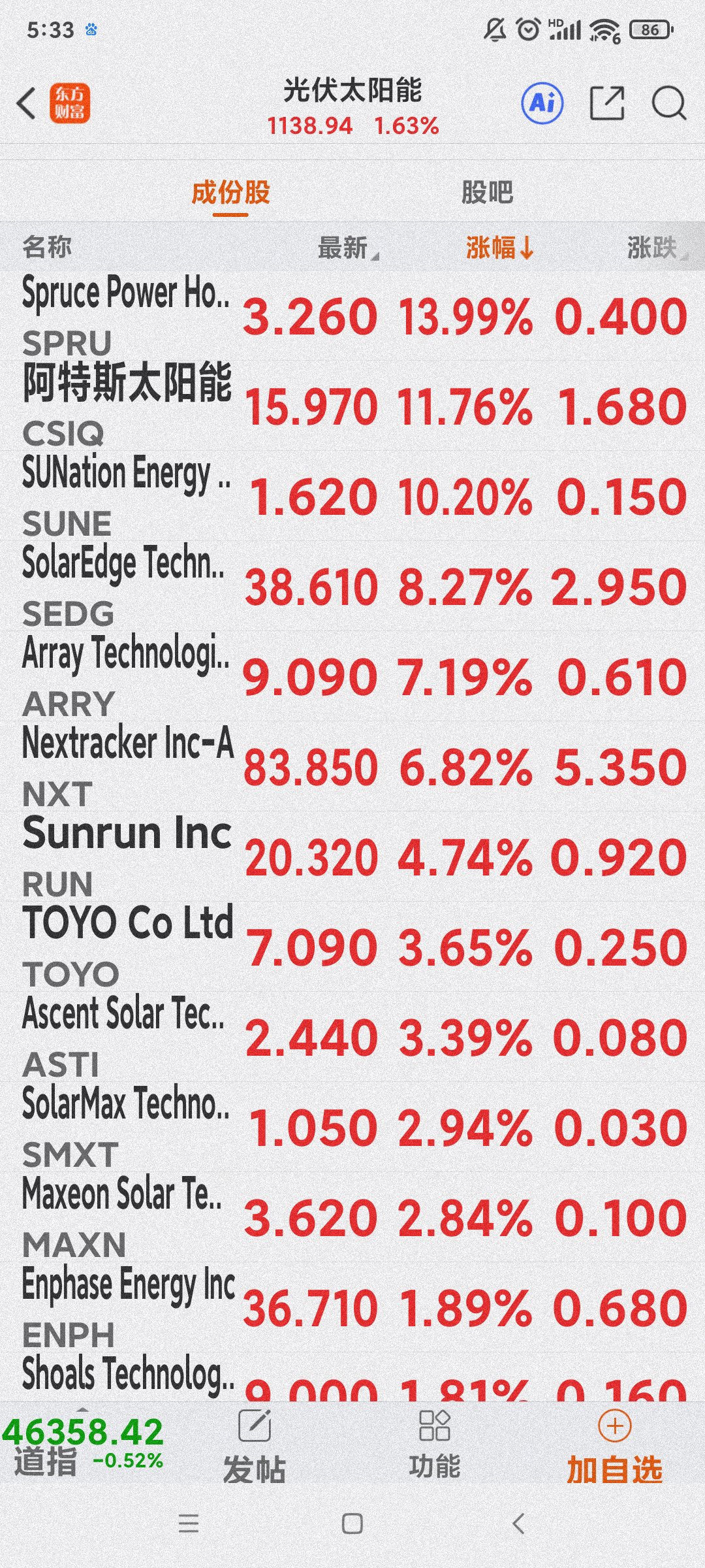 美国股市夜盘,光伏太阳能板块,集体大涨!