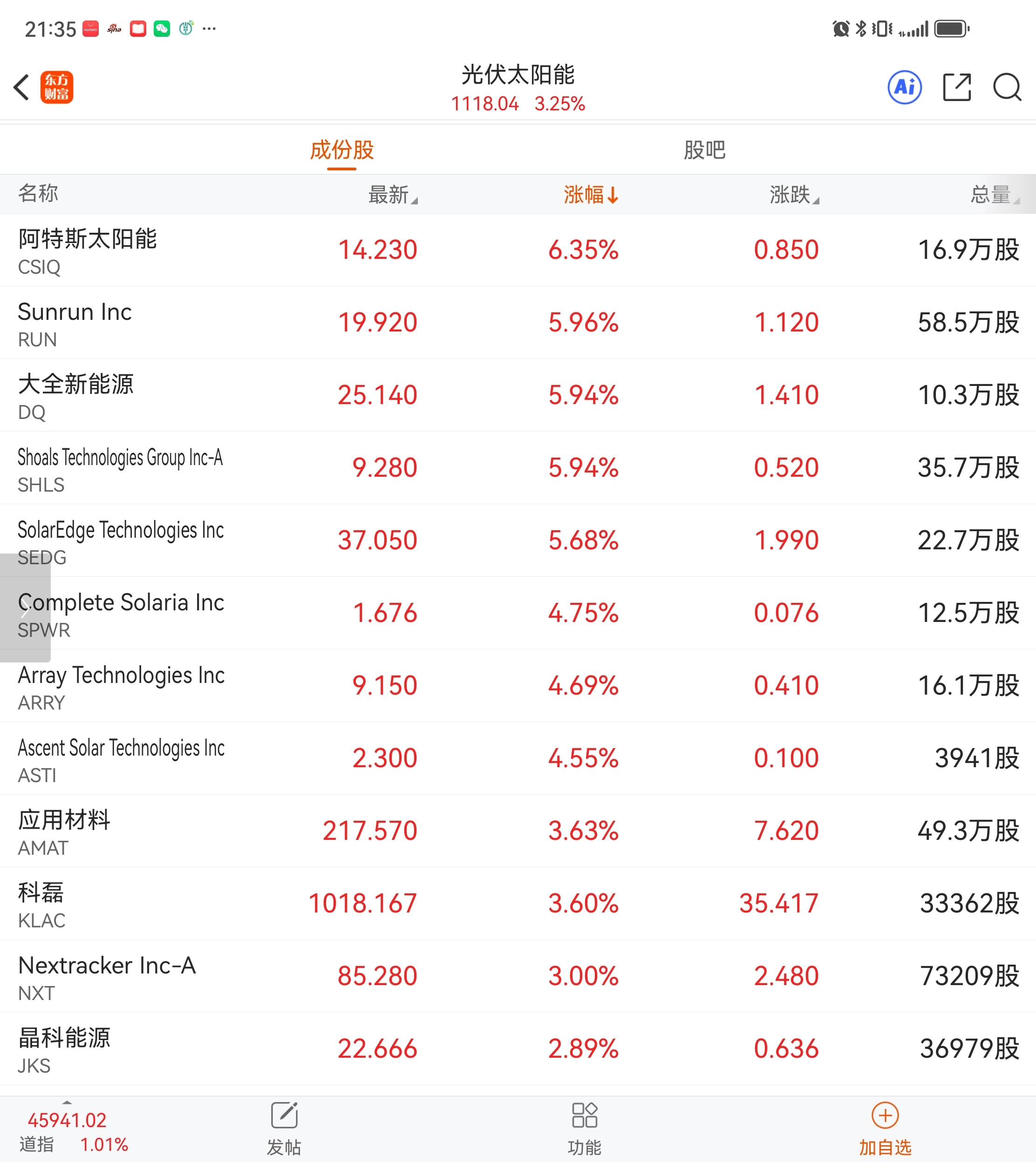 $阳光电源(SZ300274)$ 明天把心放肚子里咯,只要大盘没问题,明天一根中阳线是有的。还有就是美股氢能源,固态,光伏都在涨!明天重拾山河!