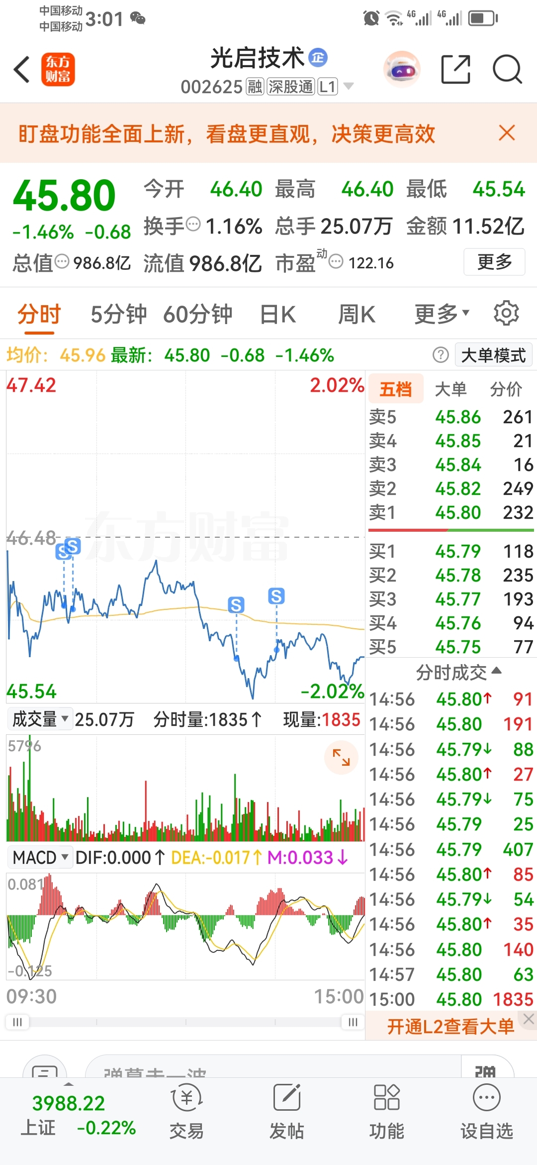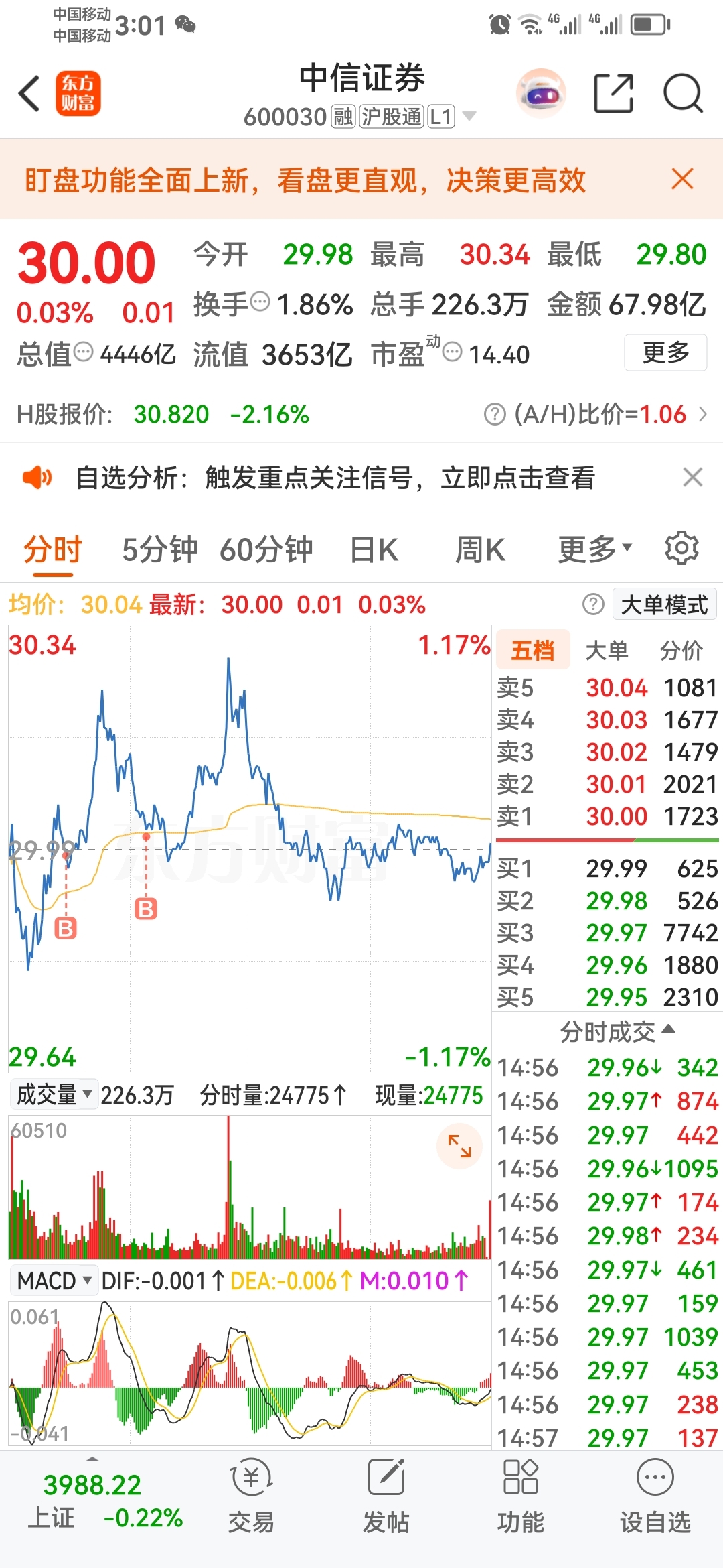 大盘今天冲高回落,自己的持股也基本同步,由红转绿。今天减持了光启,这段时间都是跟跌不跟涨,成了躲牛市标的,换了中信,感觉证券有上冲势头。ETF今天也好玩,都给出了很好的进出场点位