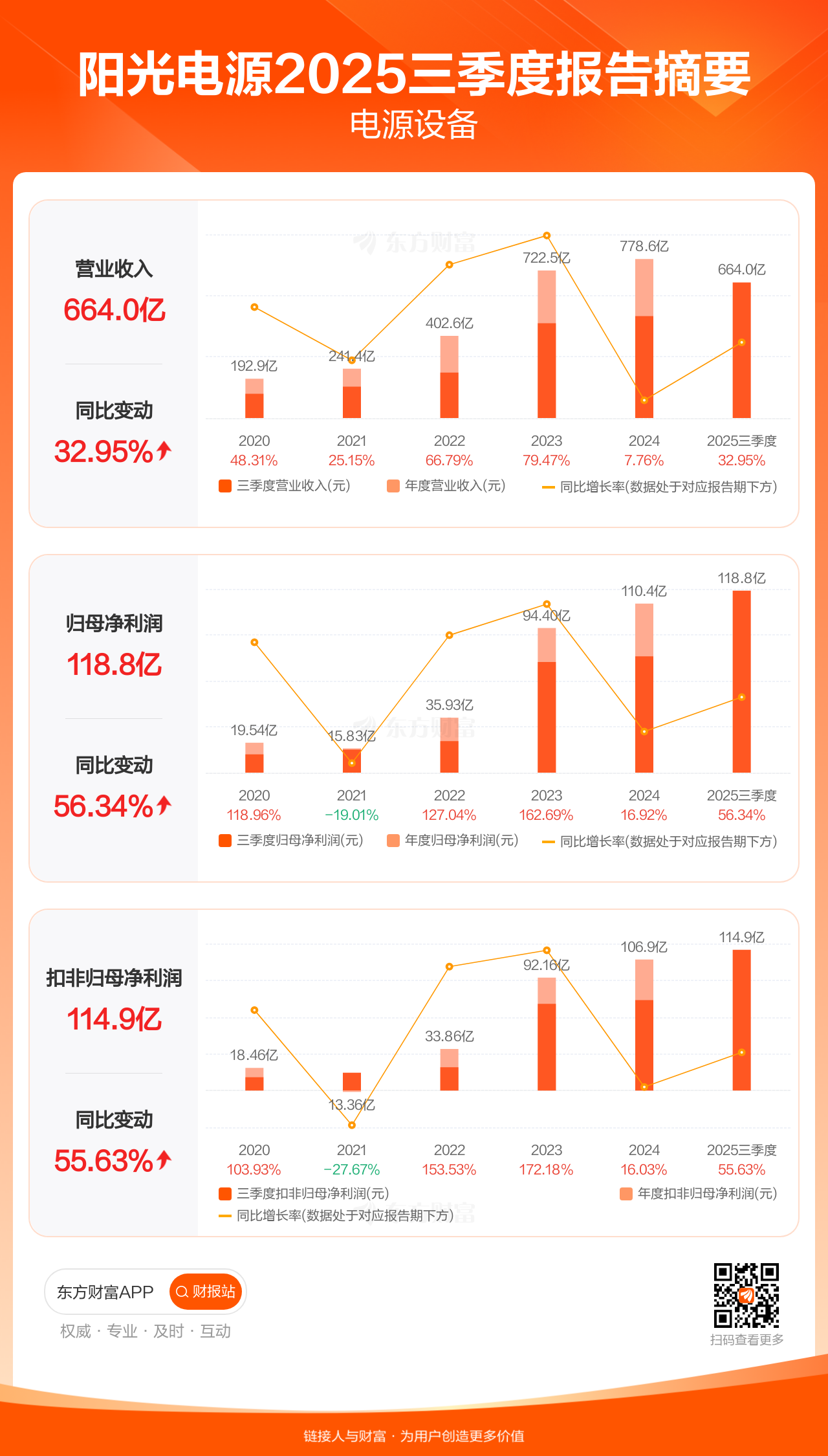 阳光电源10月29日发布2025年三季报显示,公司前三季实现营业收入664.02亿元,同比增长32.95%;归母净利润118.81亿元,同比增长56.34%;扣非归母净利润114.86亿元,同比增长55.63%。