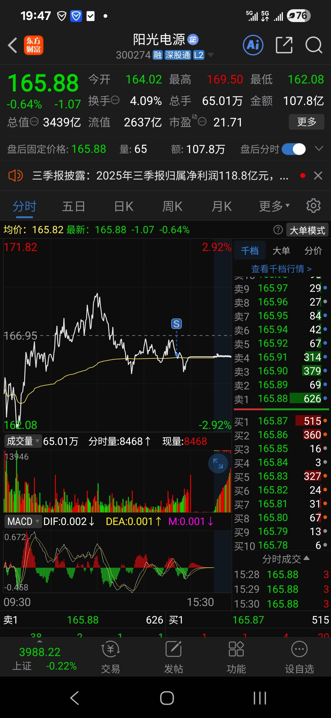 $阳光电源(SZ300274)$ 已卖,利好落地,明天跌