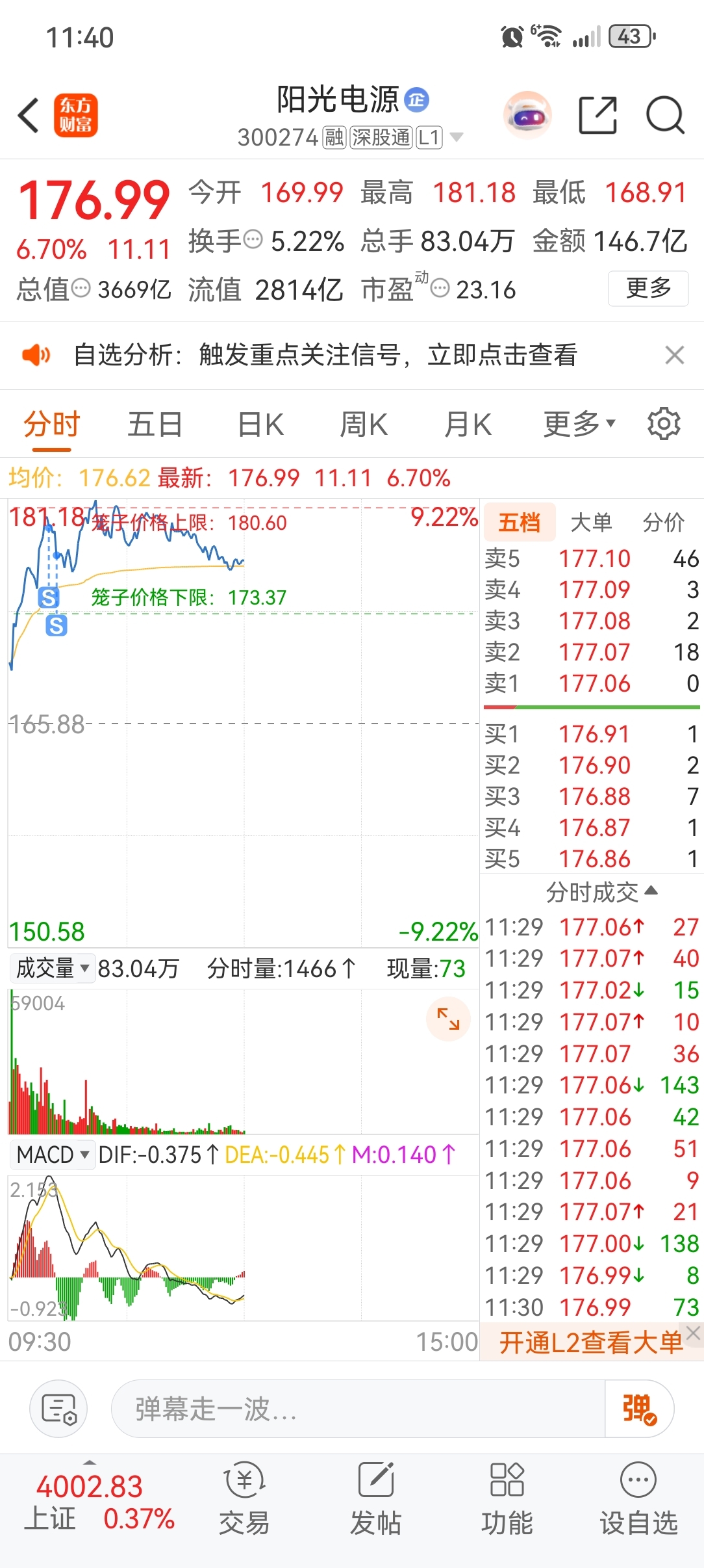 $阳光电源(SZ300274)$ 次高点清仓了,涨停不后悔。谢谢主力和各位散户。 后势看到300元,等有低点再进。