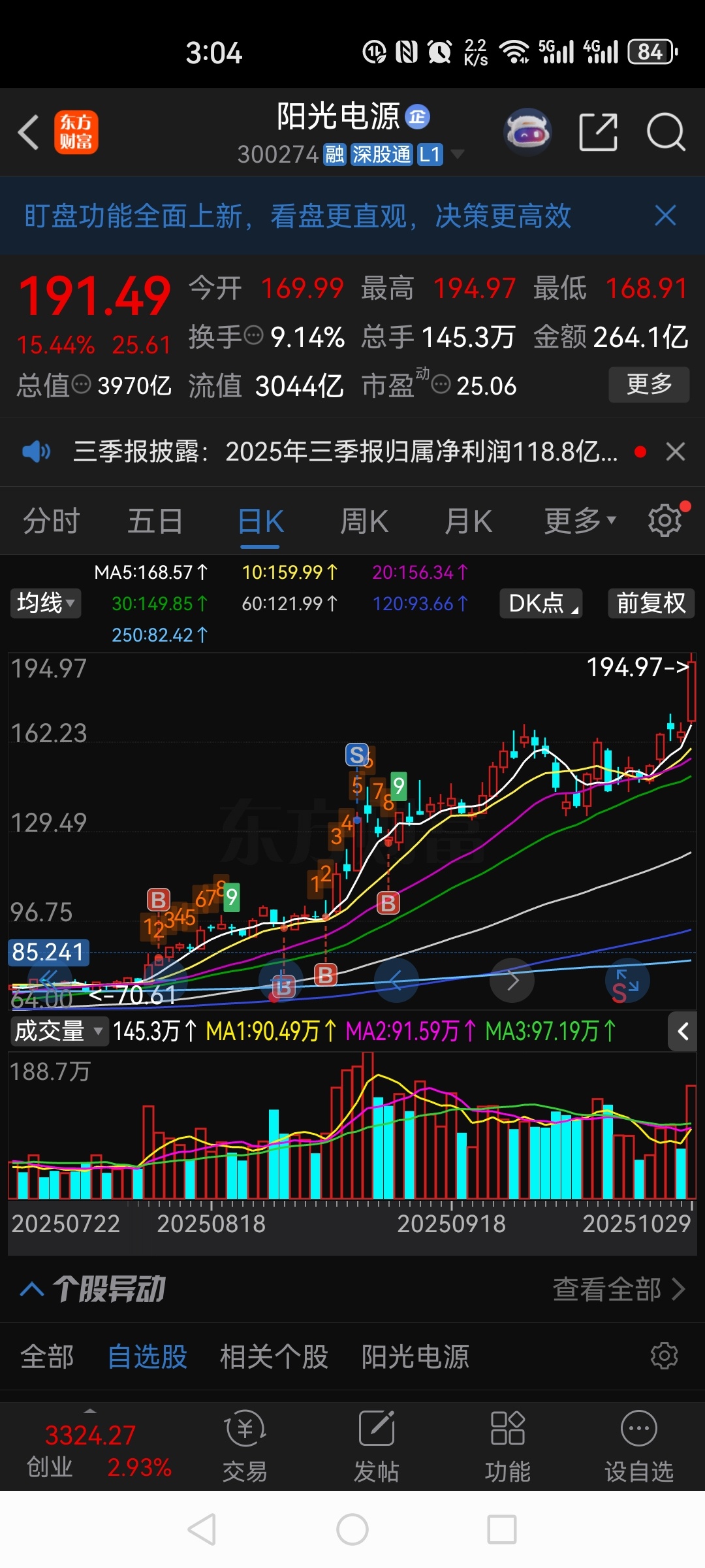 入市以来单个股票盈利比例最大的,感谢阳光,明后天第一目标位200元见!