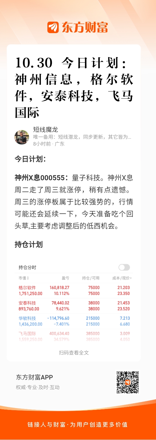 神州X息000555:量子科技。神州X息周二走了周三就涨停,稍有点遗憾。周三的涨停板属于比较强势的,行情可能还会延续一下,今天准备吃个回头草,主要考虑调整后的低西机会。