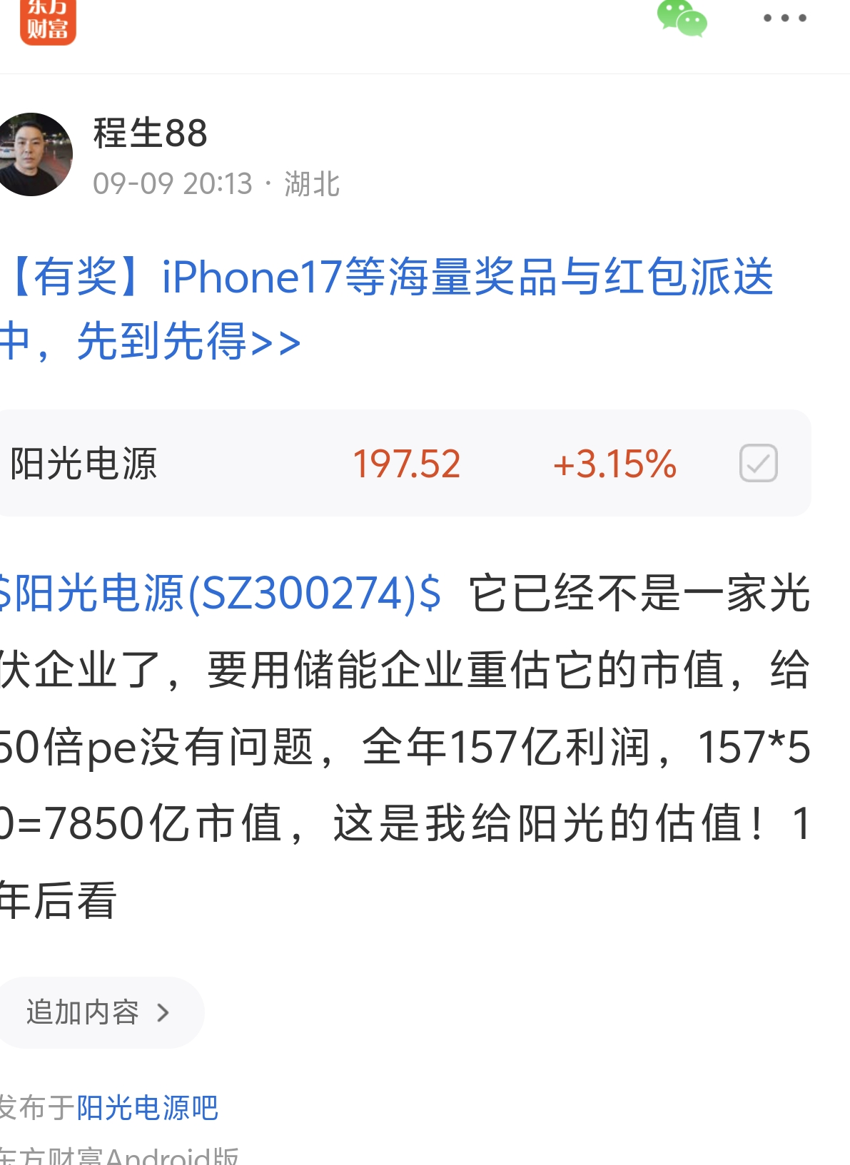 本人9月9号发帖,预测阳光未来7000亿市值,目前来到4000亿,