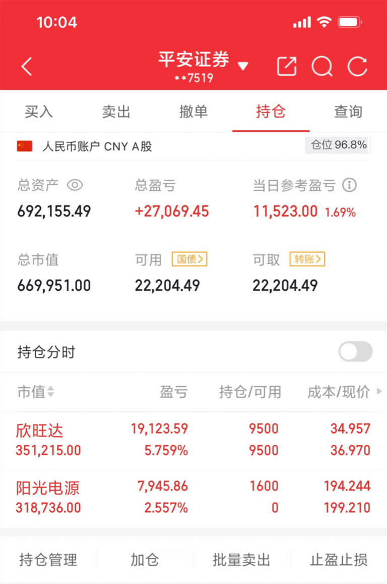【60W炒股之旅|第5天】今日实盘操作简记:•继续持有:欣旺达卖出:买入:阳光电