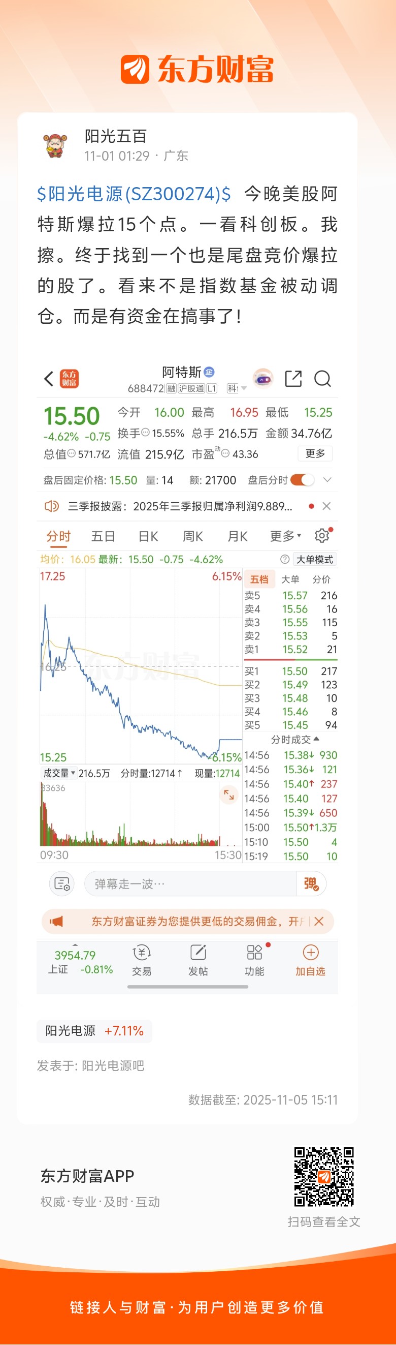 $阳光电源(SZ300274)$ 今晚美股阿特斯爆拉15个点。一看科创板。我擦。终于找到一个也是尾盘竞价爆拉的股了。看来不是指数基金被动调仓。而是有资金在搞事了!