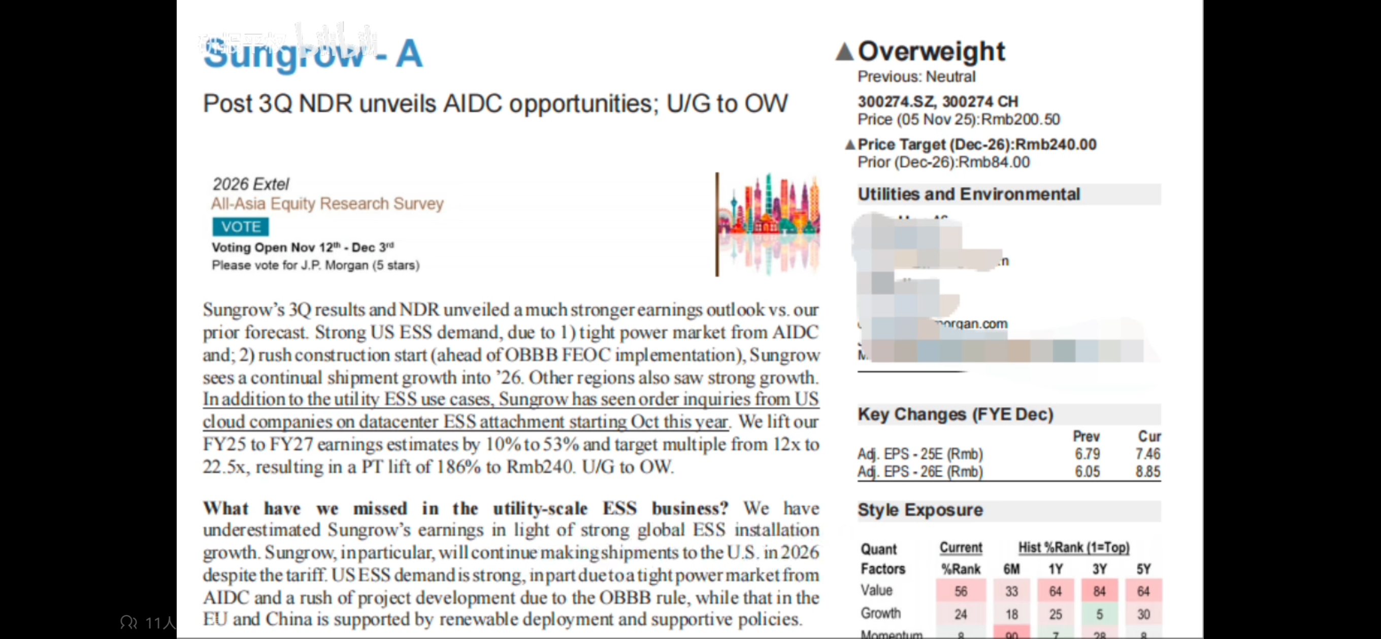 $阳光电源(SZ300274)$ 昨天摩根大通的研报给的合理股价是240,给出了超配的评级