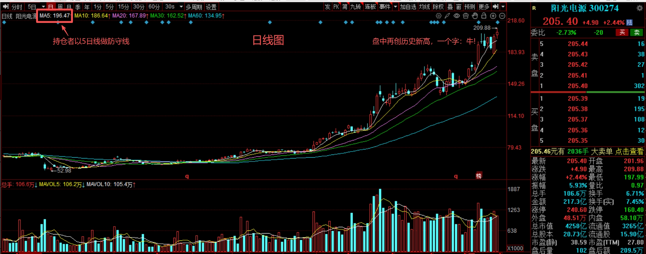 今日盘中再创历史新高,收盘站稳所有均线之上,整体维持强势上升格局。当前需观察5日
