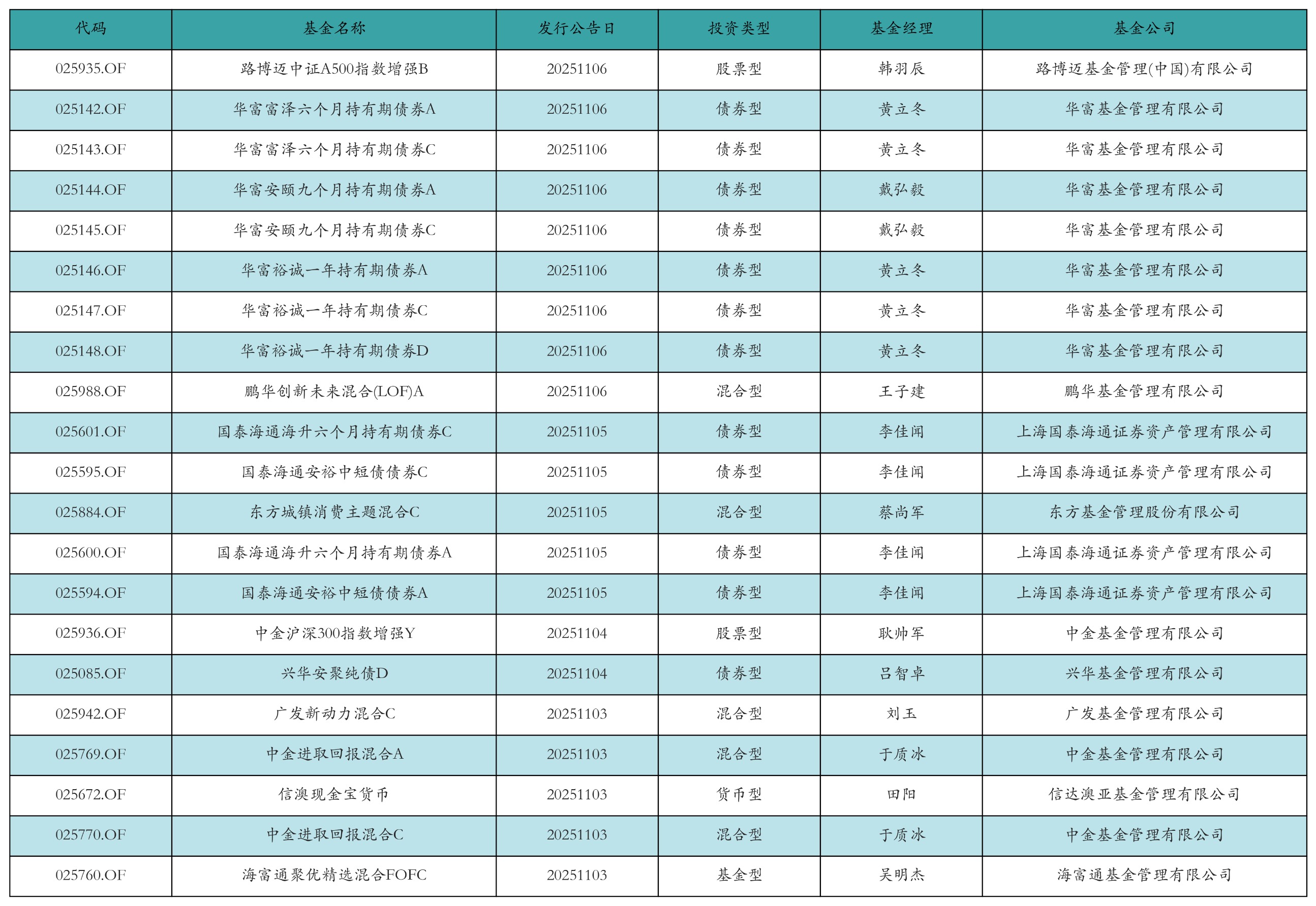 上周有21只新基金发行,分别为:路博迈中证A500指数增强B、华富富泽六个月持有期债券A、华富富泽六个月持有期债券C、华富安颐九个月持有期债券A、华富安颐九个月持有期债券C、华富裕诚一年持有期债券A、华富裕诚一年持有期债券C、华富裕诚一年持有期债券D、鹏华创新未来混合(LOF)A、国泰海通海升六个月持有期债券C、国泰海通安裕中短债债券C、东方城镇消费主题混合C、国泰海通海升六个月持有期债券A、国泰海通安裕中短债债券A、中金沪深300指数增强Y、兴华安聚纯债D、广发新动力混合C、中金进取回报混合A、信澳现金宝货币、中金进取回报混合C、海富通聚优精选混合FOFC,详情见下表: