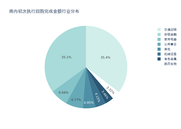 按照初次执行金额所在不同行业分布,金额最高的3个行业分别为:交通运输、非银金融、家用电器,详情见下图:
