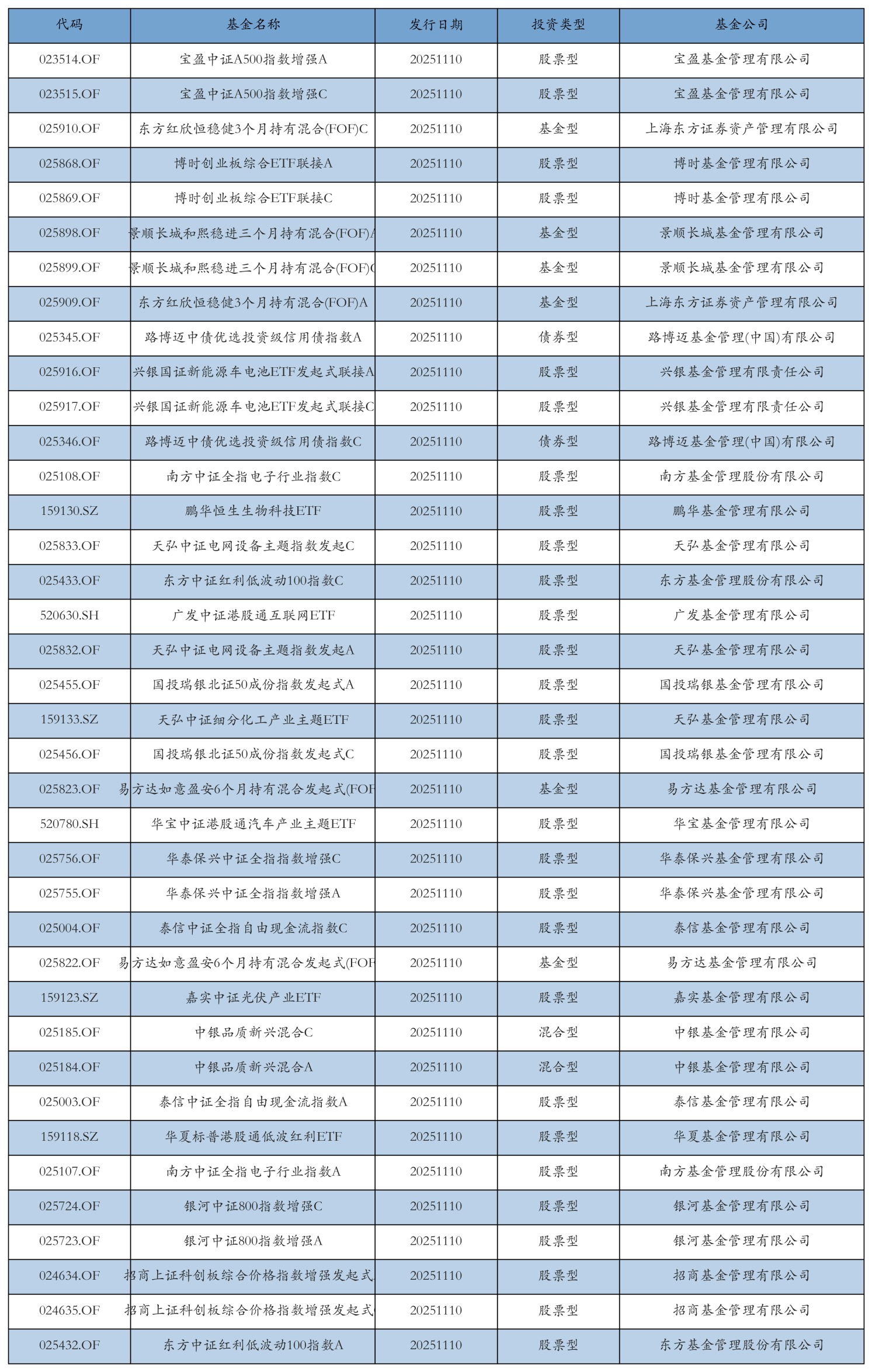 昨日有38只新基金发行,分别为:宝盈中证A500指数增强A、宝盈中证A500指数增强C、东方红欣恒稳健3个月持有混合(FOF)C、博时创业板综合ETF联接A、博时创业板综合ETF联接C、景顺长城和熙稳进三个月持有混合(FOF)A、景顺长城和熙稳进三个月持有混合(FOF)C、东方红欣恒稳健3个月持有混合(FOF)A、路博迈中债优选投资级信用债指数A、兴银国证新能源车电池ETF发起式联接A、兴银国证新能源车电池ETF发起式联接C、路博迈中债优选投资级信用债指数C、南方中证全指电子行业指数C、鹏华恒生生物科技ETF、天弘中证电网设备主题指数发起C、东方中证红利低波动100指数C、广发中证港股通互联网ETF、天弘中证电网设备主题指数发起A、国投瑞银北证50成份指数发起式A、天弘中证细分化工产业主题ETF、国投瑞银北证50成份指数发起式C、易方达如意盈安6个月持有混合发起式(FOF)C、华宝中证港股通汽车产业主题ETF、华泰保兴中证全指指数增强C、华泰保兴中证全指指数增强A、泰信中证全指自由现金流指数C、易方达如意盈安6个月持有混合发起式(FOF)A、嘉实中证光伏产业ETF、中银品质新兴混合C、中银品质新兴混合A、泰信中证全指自由现金流指数A、华夏标普港股通低波红利ETF、南方中证全指电子行业指数A、银河中证800指数增强C、银河中证800指数增强A、招商上证科创板综合价格指数增强发起式A、招商上证科创板综合价格指数增强发起式C、东方中证红利低波动100指数A,详情见下表: