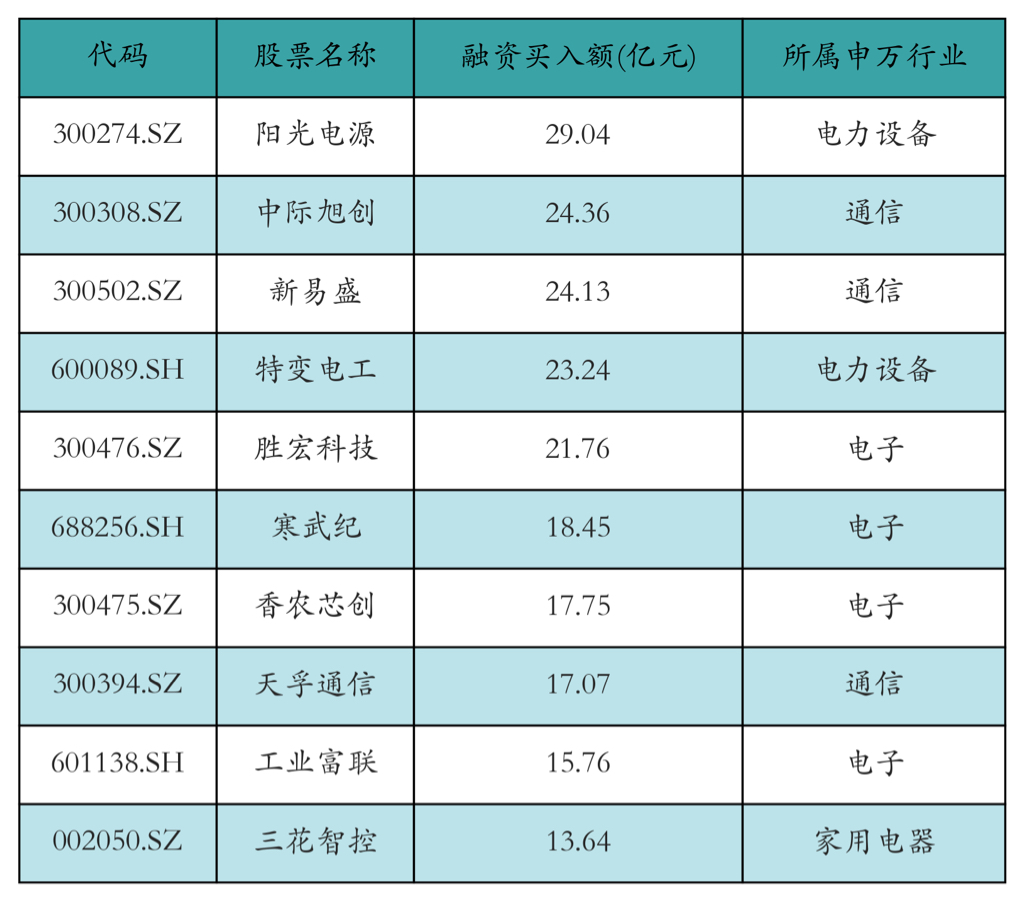 两市共有3462只个股有融资资金买入,其中阳光电源、中际旭创、新易盛排名前三,买
