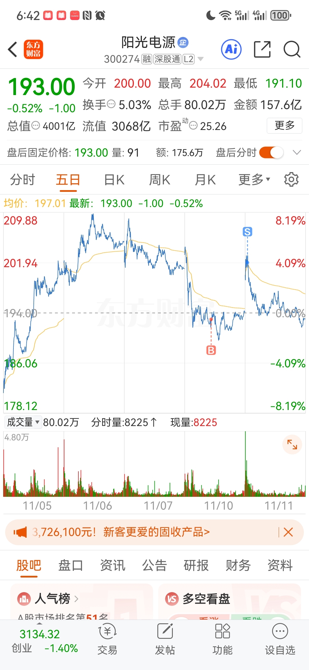 $阳光电源(SZ300274)$ 还是价位太高了,这样都能砸绿,还好冲高跑了。也是因为太高,这票没有成本优势,抄底一波赚了就撤。大家加油!