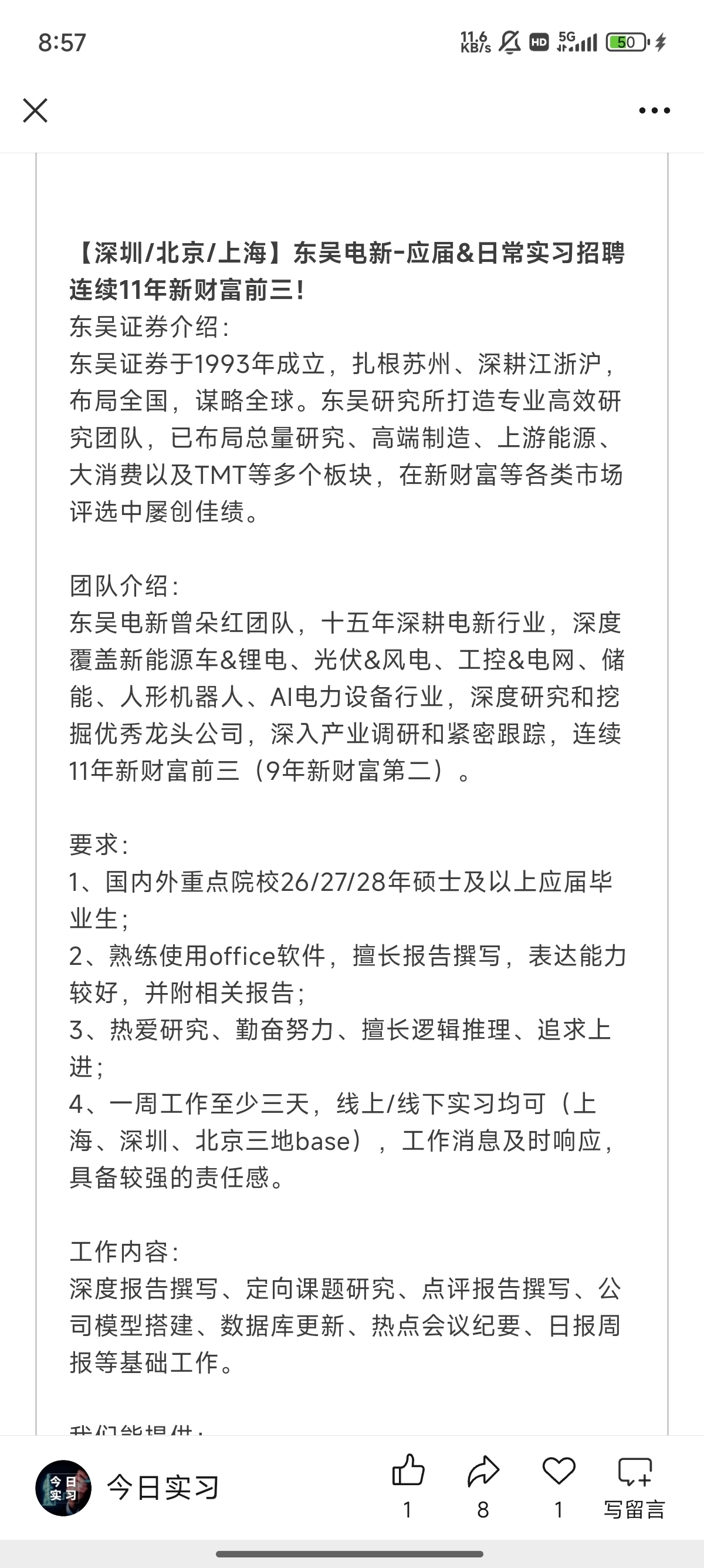 附一张东吴曾朵红的日常实习招聘,这可是在去年连跌8个月的低谷还不断跟踪调查阳光电源的
