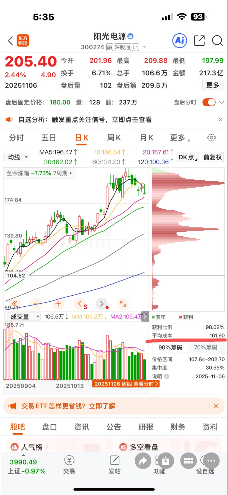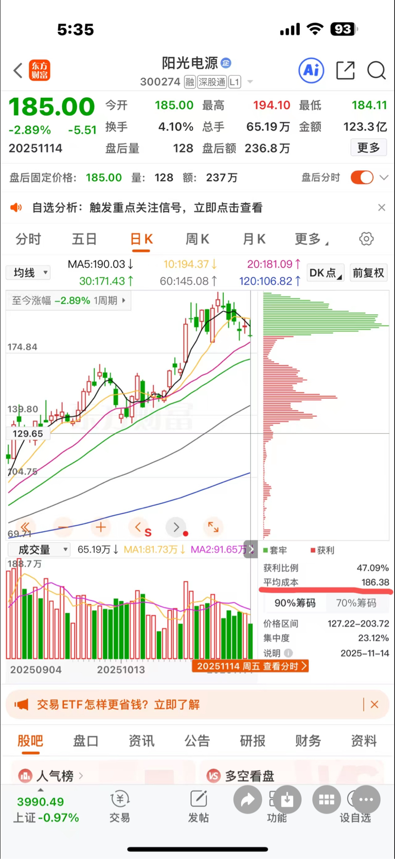 $阳光电源(SZ300274)$ 这段时间的成交量,每天都是居榜首,这可牛了啊,比阳光市值大的股票多了去了,为啥每天排第一,不长脑袋想想吗?真牛啊,连续很多天了都是居榜首,然后看筹码分布,下面的跑了差不多了,看平均持仓成本,最近这周主力非常成功,已经把散户的持仓成本从160变成186了,在180-195这个位置出货出的很成功,接下来的走势就是下周跌破180,一路阴跌几个月,要抄底的等140-150以下再抄底,不要抄在半山腰