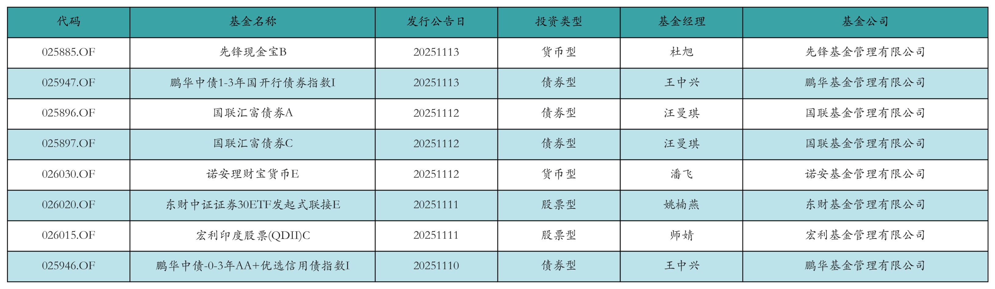上周有8只新基金发行,分别为:先锋现金宝B、鹏华中债1-3年国开行债券指数I、国联汇富债券A、国联汇富债券C、诺安理财宝货币E、东财中证证券30ETF发起式联接E、宏利印度股票(QDII)C、鹏华中债-0-3年AA+优选信用债指数I,详情见下表: