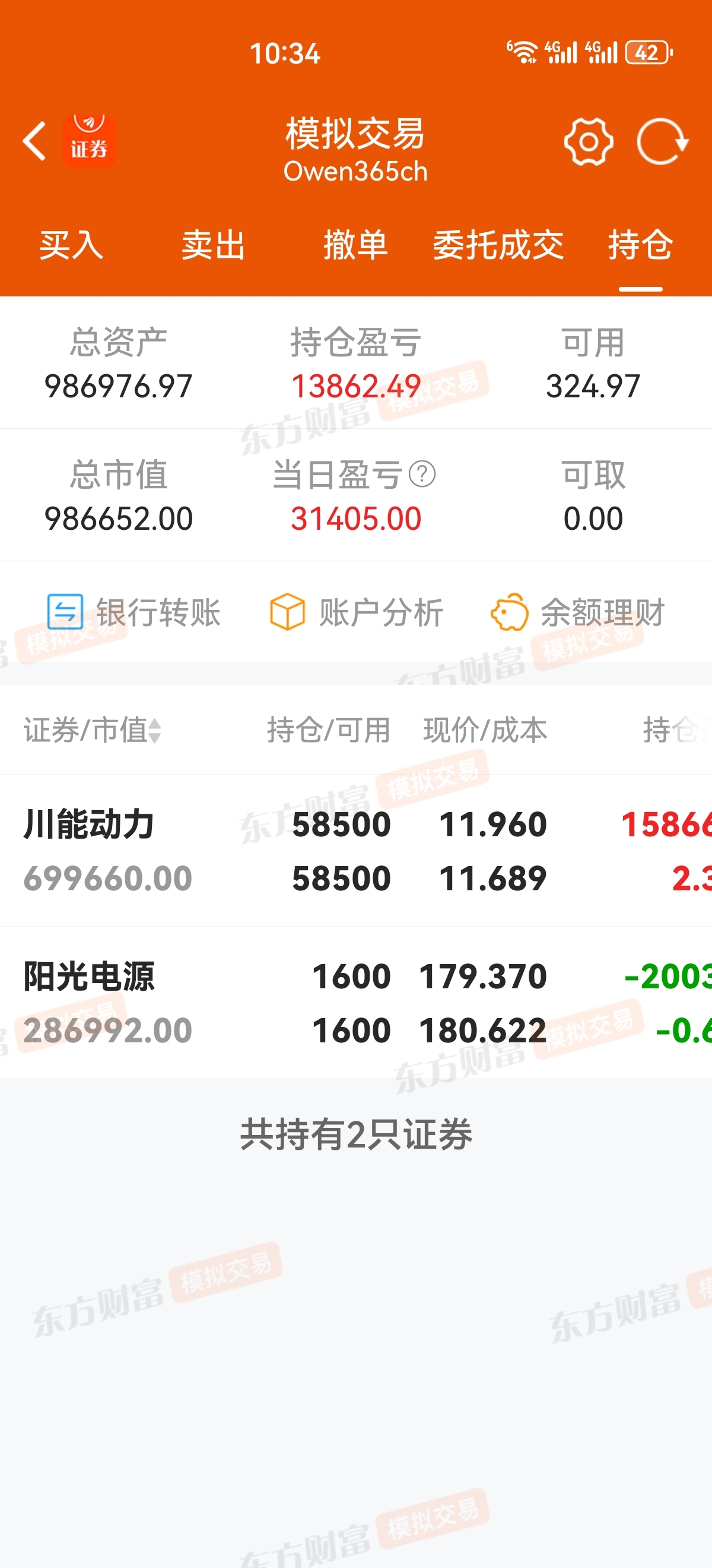 我东财的模拟比赛里,川能开始赚钱了,可我自己账户还亏着5个点,上周五的跌停加仓加