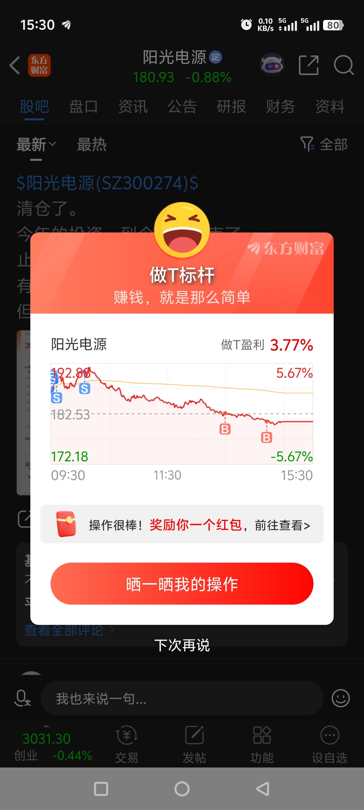 $阳光电源(SZ300274)$ 本来不想做T,每天就是冲高回落太难受,不动手也不好。跟着量化干就完了。