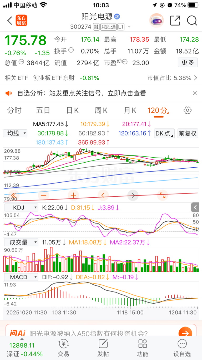 $阳光电源(SZ300274)$ 今天收不了人红就是个死叉趋势,120分钟线