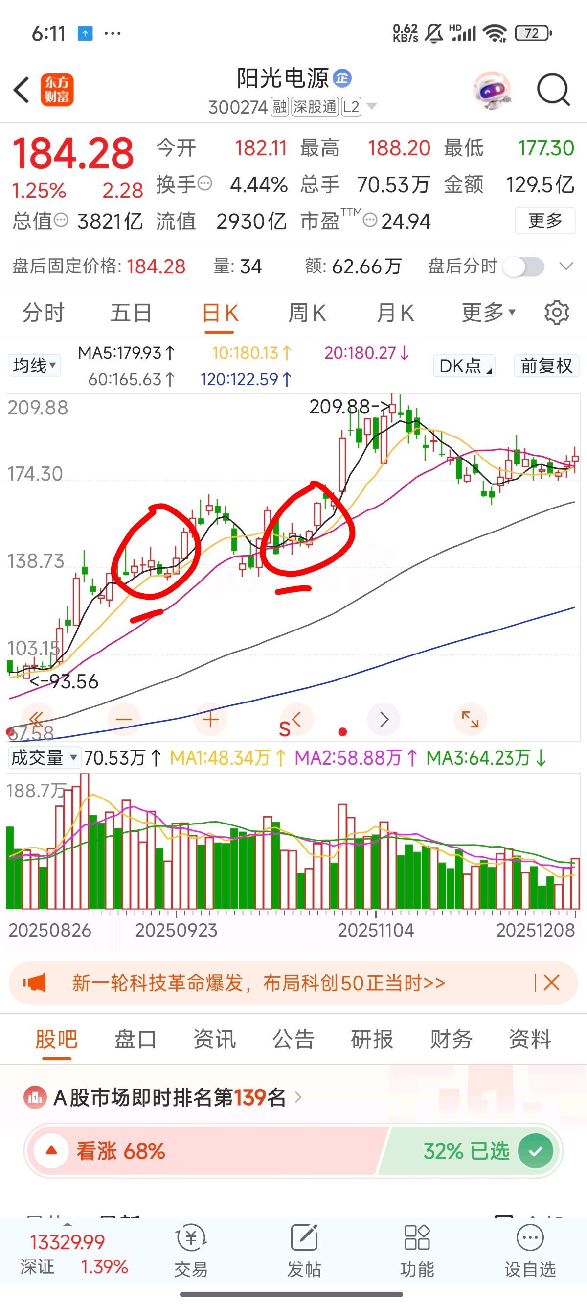 $阳光电源(SZ300274)$ 看我图里的两个圈,出现这种射击之星的K线,第二天必跌无疑